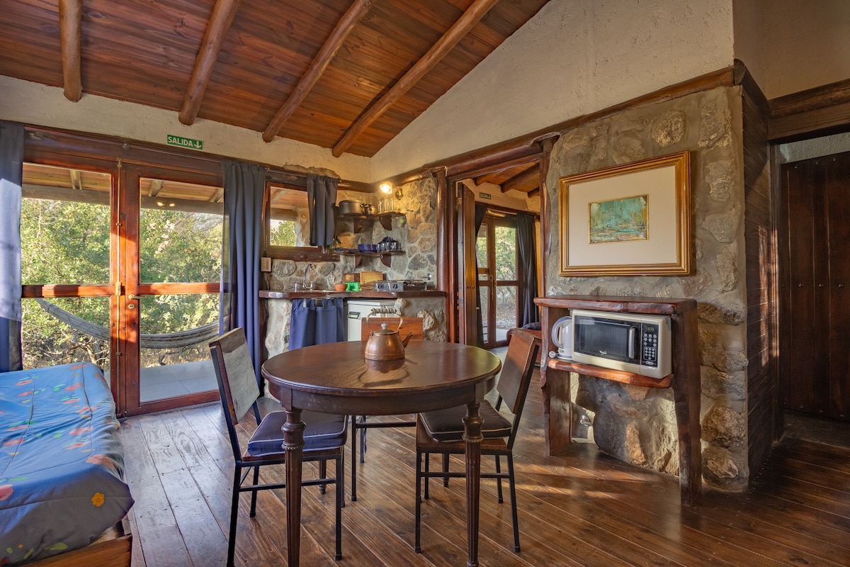 Cabaña de madera y piedra, cálida y acogedora, ubicada en pleno monte con una vista increíble a las sierras. Finamente decorada, invita al descanso y la desconexión. Cuenta con bajada privada al arroyo, senderos cercanos para recorrer y observar flora y fauna, y uno de los mejores restaurantes de Villa de Merlo a pocos metros. Naturaleza, confort y una experiencia única.