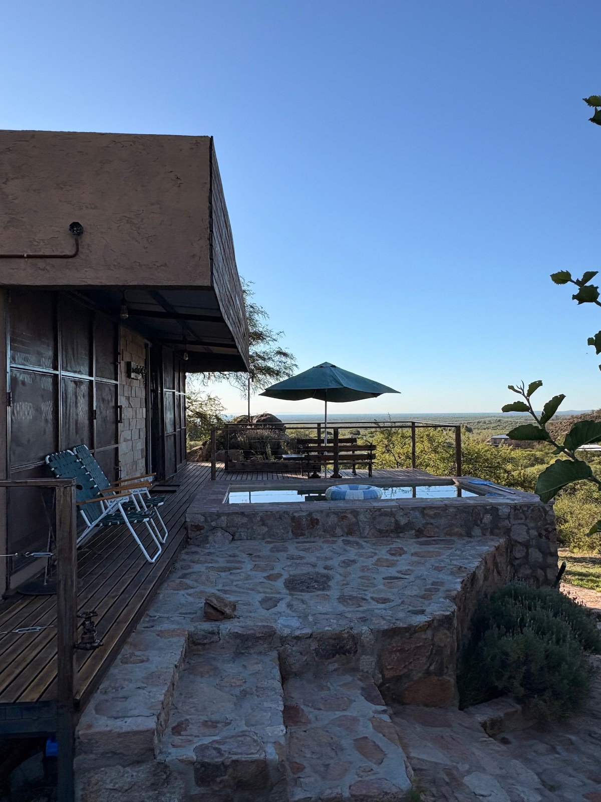 Cabaña al pie de las sierras con bajada propia al arroyo. Inmerso en el monte nativo rodeado de naturaleza. En el verano su mini piscina con vista a los cerros, su galería con asador y su gran jardín serán tu refugio. La salamandra te dará calor en invierno mientras disfrutas de la vista a los cerros nevados . La casita está pensada para que la privacidad sea lo más importante.