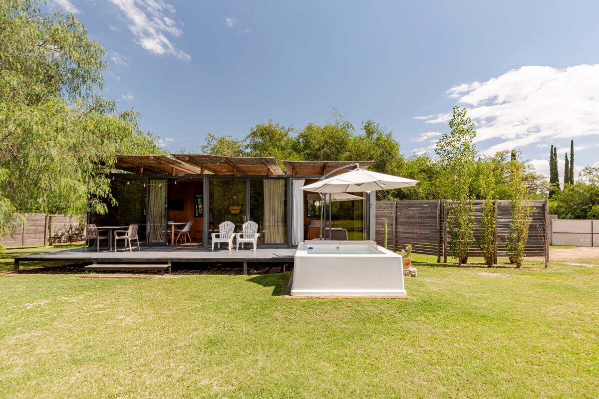Cabaña al pie de las sierras con bajada propia al arroyo. Inmerso en el monte nativo rodeado de naturaleza. En el verano su mini piscina con vista a los cerros, su galería con asador y su gran jardín serán tu refugio. La salamandra te dará calor en invierno mientras disfrutas de la vista a los cerros nevados . La casita está pensada para que la privacidad sea lo más importante.
