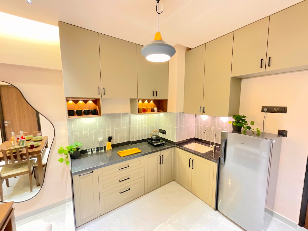 Boho Style Luxury Studio with Jacuzzi and Garden. A peaceful getaway. Fully loaded with WiFi, JBL 2.1 Home Theatre, BT Music System, Full-HD LED TV. A stylish bathroom with toiletries. Pantry with tea/coffee supplies, RO water, Microwave, Induction Hob, Fridge & s/w Toaster. Fenced garden for children. Dine in the garden with beautiful weather. Jacuzzi has hot water that can be used anytime. Common amenities on-site like swimming pool, games room, gym, mini theatre, cycling and restaurant.