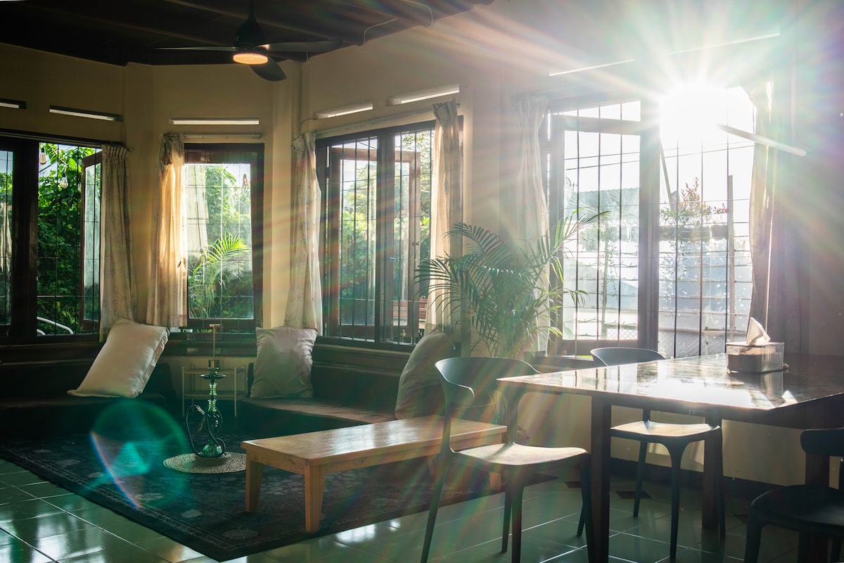 A Cabin lodging retreat located in the heart of Malang. Hopeful, that our little in-town getaway's uniquely cozy space can create a safe warm blanket for all to feel at home. Like visiting grandma's house without the dusty outdated furniture & where every landmarks around town are only a 10min ride away. A shelter curated with love, nestled in a calm neighborhood that enjoy the serene daylight & quiet evenings. A cabin surrounded by tall lush private greenery, edible herbs & fruit trees.
