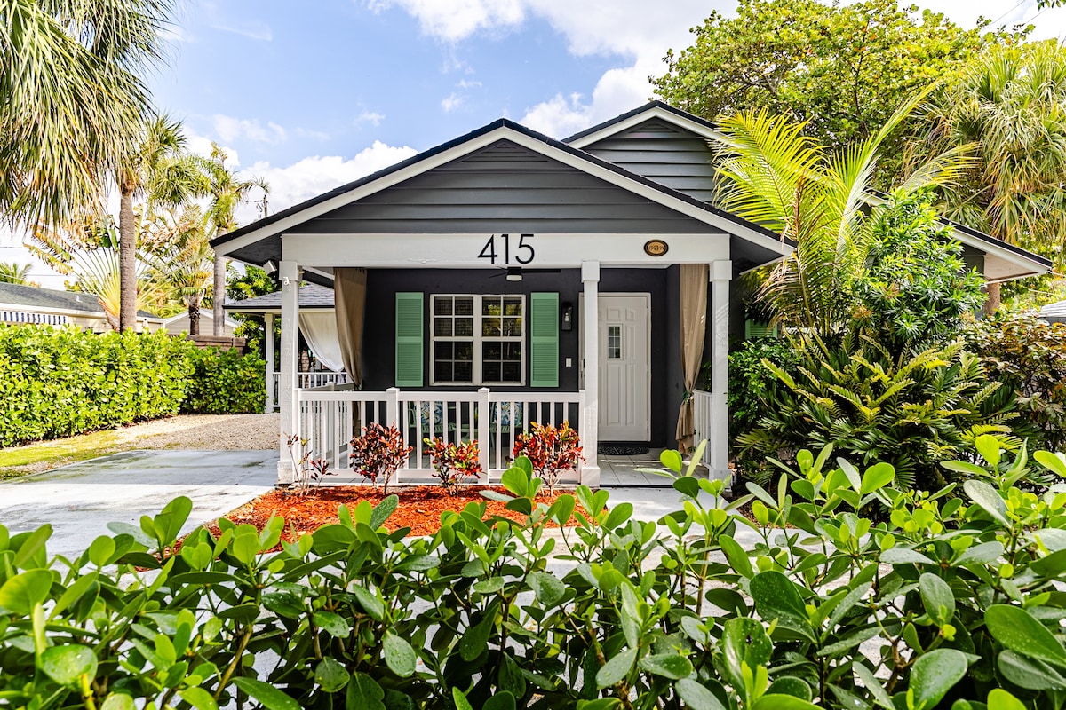 Welcome to historic South Palmway! Tropical views, Florida vibes, and sun-soaked poolside tanning. Our private paradise is located walking distance to downtown and minutes from the beach. Escape into our lush, modern oasis ~ a 2/2 main house plus 1/1 guest cottage sleeps 7. Fully-fenced yard, tiki porch, grill, hammock, art-deco pool and high-end loungers. Two free bikes! Custom-kitchen, Moroccan tile and vintage soak tub complete the spa-like experience. Welcome to the best of barefoot living!