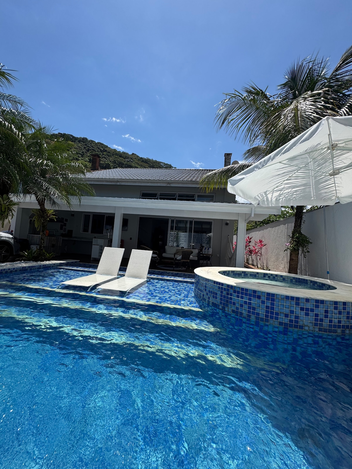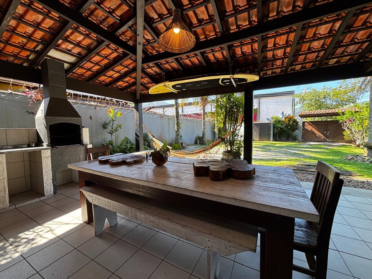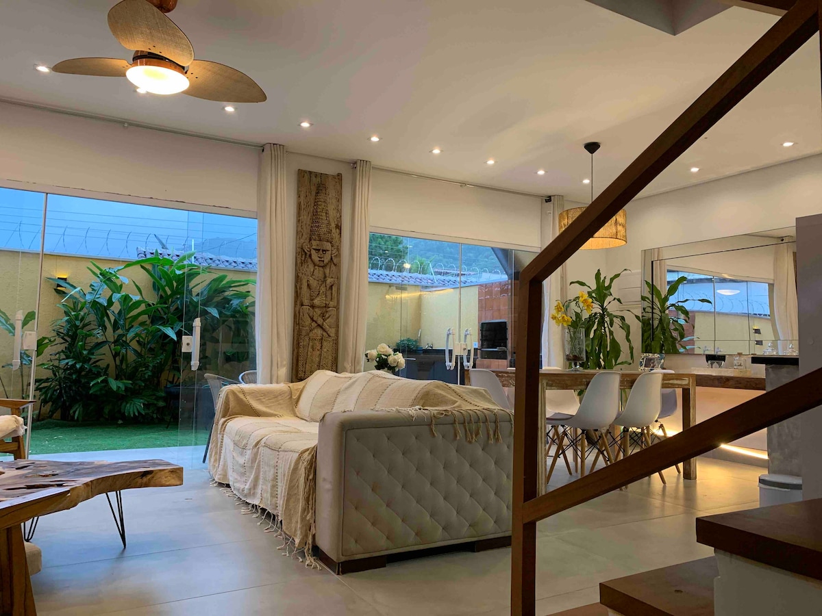 Casa em condomínio fechado, decoração charmosa moderna rústica, a apenas 7min da praia caminhando e 2 min dos principais restaurantes e SM. Rodeada pelo verde da Mata Atlântica, recém reformada, 3 vagas de garagem, 3 suítes de casal que acomodam confortavelmente até 6 pessoas e 3 crianças. A cozinha é para quem aprecia se entreter com familiares e amigos enquanto cozinha, pois é integrada com a sala bem ampla, churrasqueira e piscina privativa. Dias frios temos lareiras e dias chuvosos sala TV.