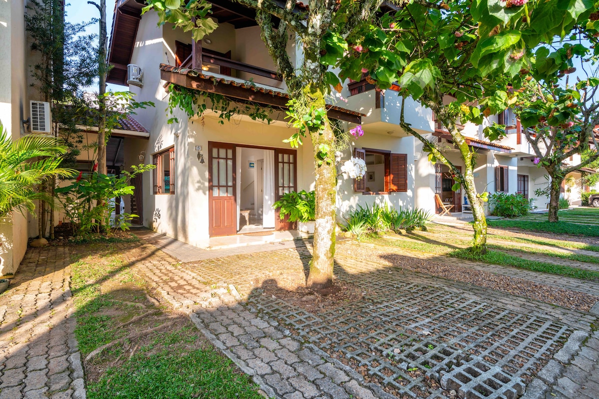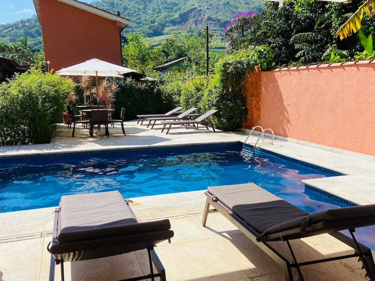 Casa com estilo e conforto , suíte 5 estrelas (chuveiro a gas e banheira grande para dois com hidro, ar condicionado, ventilador teto, colchao queen de qualidade, lençois de algodao 400 fios ,TV, WIFI rapido - dois provedores, varanda com rede, vista para mata atlantica e closet espaçoso. Para seu conforto extra - lareira, cozinha completa e kiosque-churrasqueira , piscina para dois sauna e rio tudo privativo. Jardim cercado para seu pet. Condominio tranquilo, acesso fácil as praias.