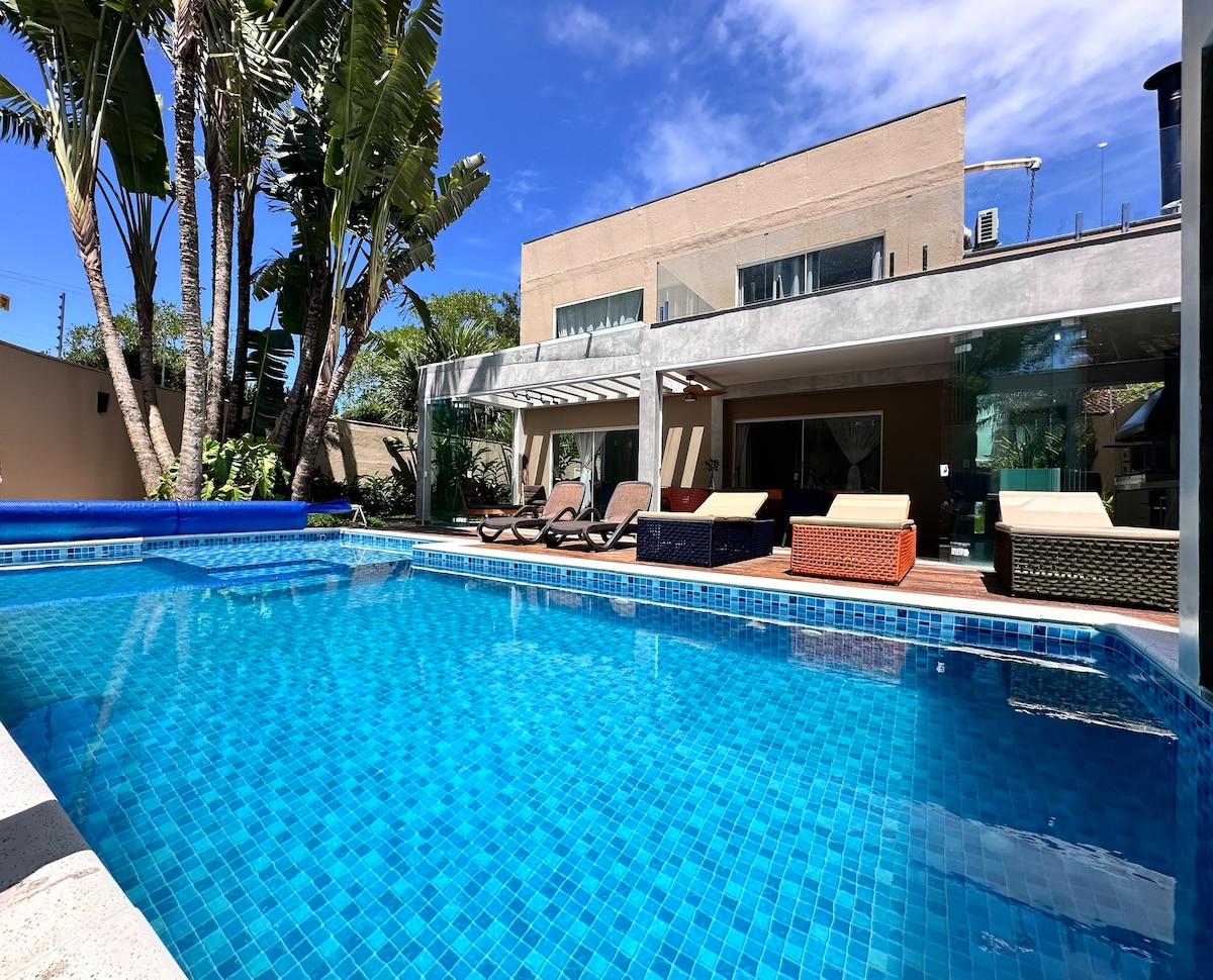 Piscina Privativa com aquecimento (sob consulta) e serviço de praia! Fica em Condomínio Fechado com toda segurança. Leve toda a família a este ótimo lugar com muito espaço para se divertir. Excelente casa com acomodação para 10 pessoas, possui 3 suítes, sala, sala de jantar, cozinha americana, 3 banheiros, lavabo, área de serviço e área gourmet/churrasqueira privativa. Fica à 500mts da praia na entrada 8 da praia que é muito mais tranquilo.