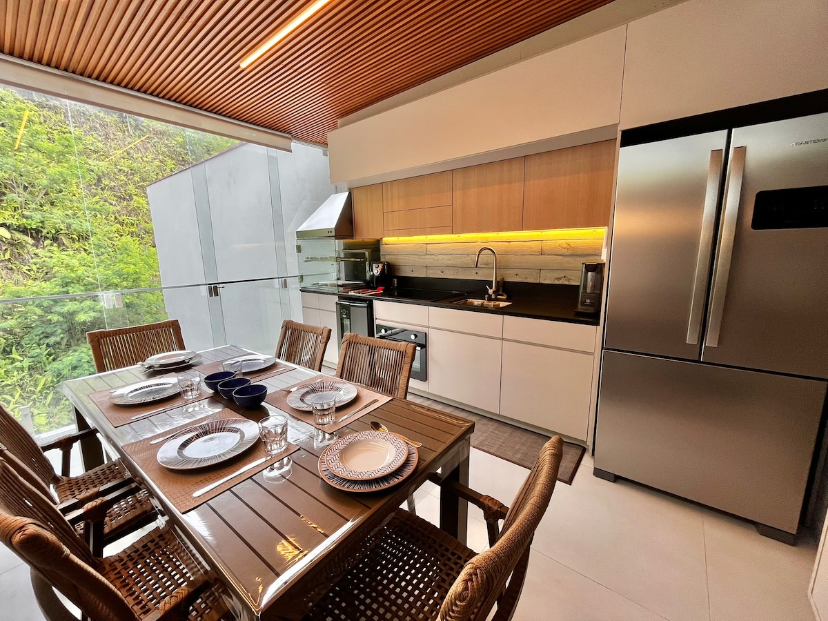 Casa novíssima, decorada por renomada arquiteta, com 4 suítes, moderna, condomínio fechado, ar condicionado quente/frio na sala e quartos. Cozinha completa, linda vista , aconchegante, lareira ecológica , terraço no pavimento superior, arejada, com acomodações para 10 adultos e 2 crianças, garagem para 3 carros de tamanhos médios , perfeita para família com crianças, 2 piscinas aquecidas , espaço teen , berço, portaria 24h, Wi-Fi, TV/cabo, caso necessário temos serviço de enxoval completo !