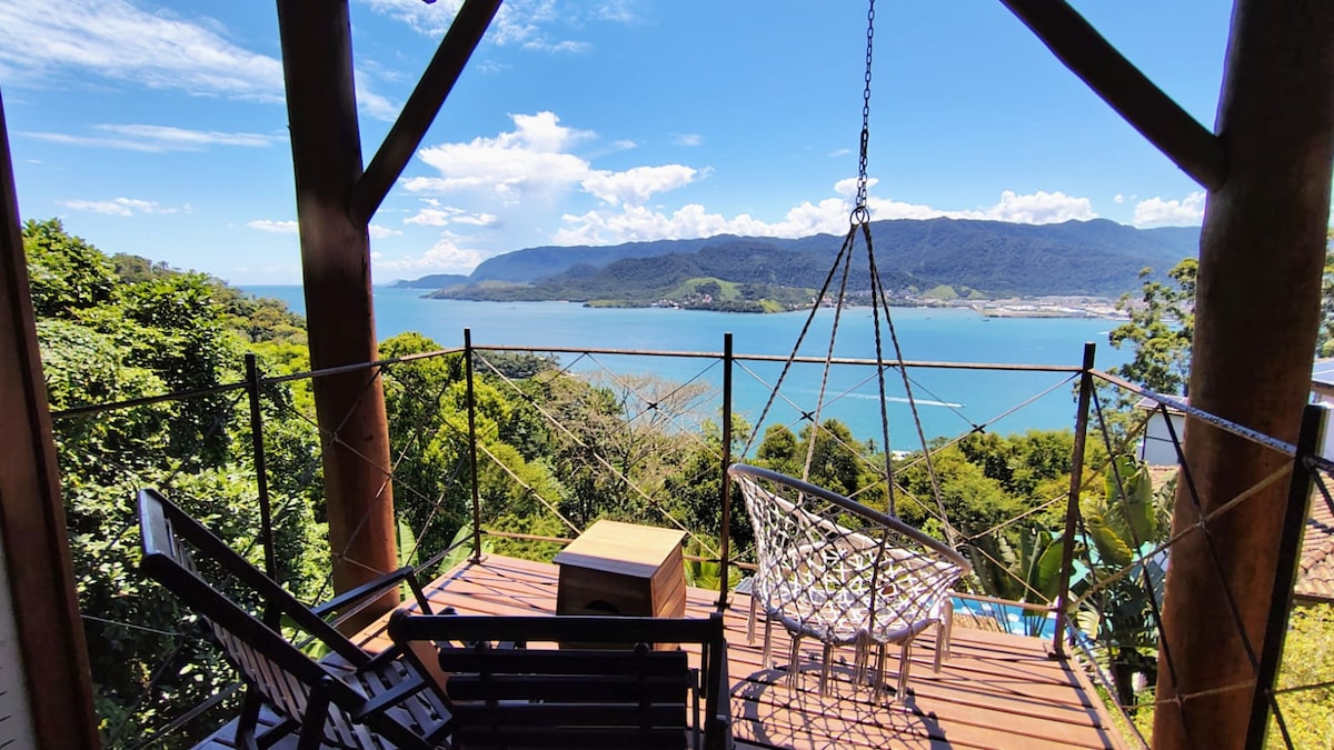Chalé com vista incrível ao mar, á 1 min andando de 2 praias de acesso controlado por terra, lugar ideal para relaxar e estar perto da natureza Pra quem procura tranquilidade e privacidade, principalmente no verão quando as praias estão lotadas. Localizada em área de preservação, onde está o Instituto de pesquisas marinhas da Usp Acesso à propriedade e praia restrito para hóspedes da casa e Instituto. Propriedade de 10.000 m2 com vistas lindas de Ilhabela e praias vizinhas.