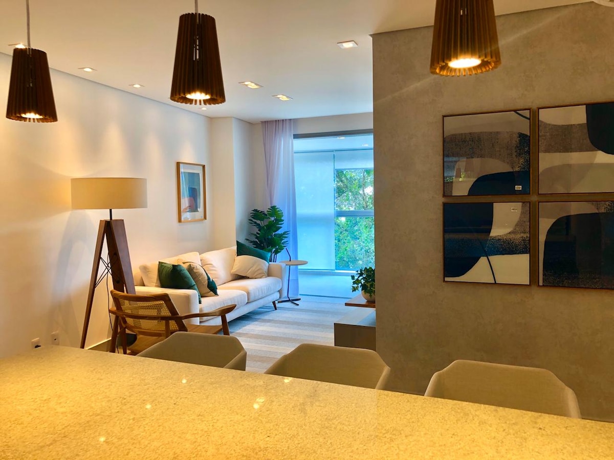 Apartamento incrível num prédio novíssimo, com decoração sofisticada e funcional. Nossa casa no inverno que oferecemos para hóspedes no verão. Ar condicionado split. WiFi 240Mb. TV 60" na sala e 35" nos quartos. Cook top, forno elétrico, microondas. Geladeira e freezer. Cozinha e copa totalmente equipadas. Lava louça, Lavadora / seca roupa. 1 suite com cama Queen e um quarto com banheiro e duas camas box. Varanda gourmet fechada com vidro, com churrasqueira e geladeira extra de bebidas.