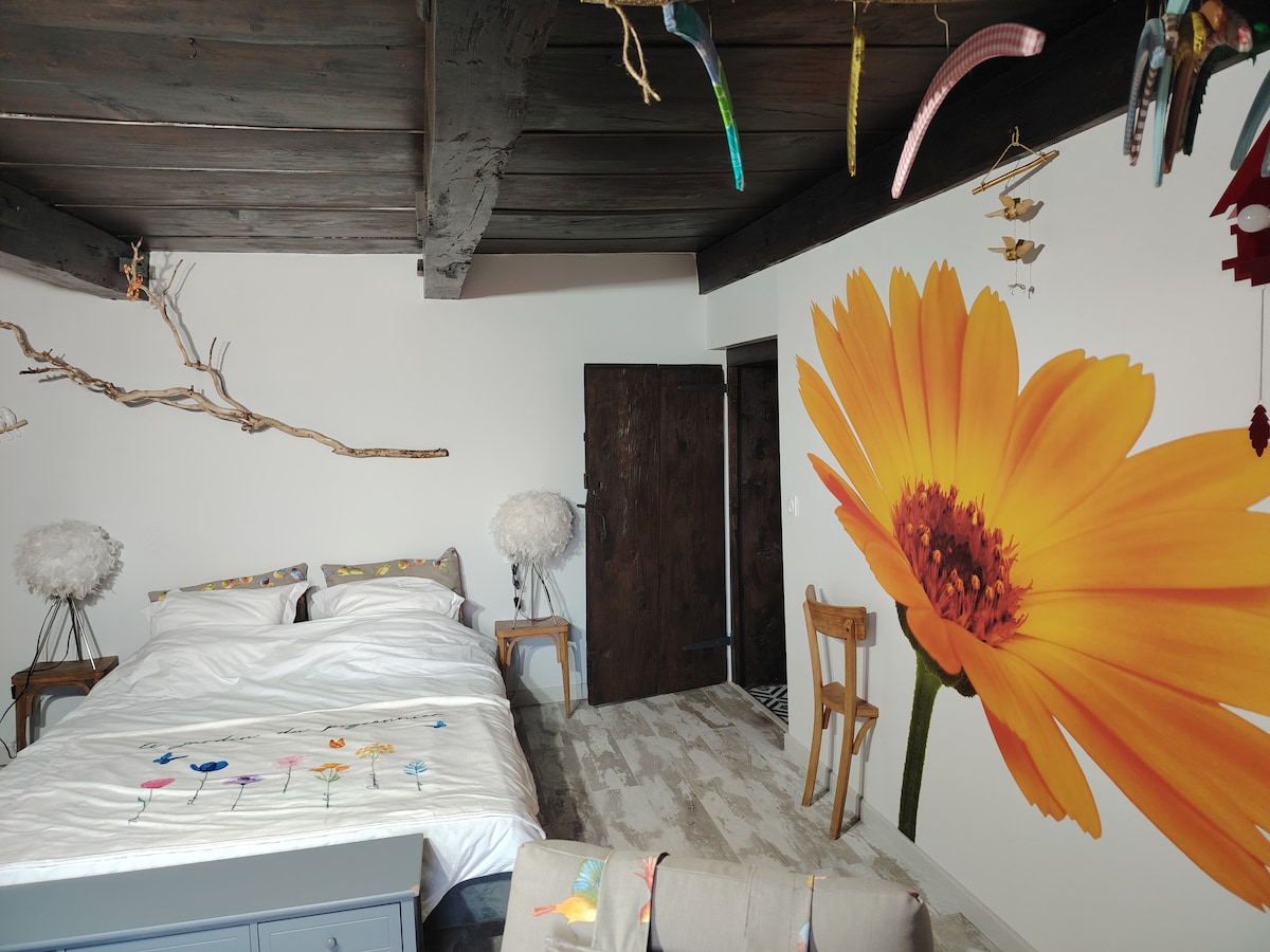 Laissez-vous séduire par cet adorable hébergement calme, au soleil levant et entouré de nature. Chambre au 1er étage avec vue sur le verger, avec lit 140/200, table, fauteuil et commode. Salle de bains privée spacieuse. Lit pour bébé. Cuisine partagée à disposition pour nourriture végétarienne uniquement. Repas dans le living ou sur la terrasse proche du jardin potager avec ses fleurs. Garage pour les vélos. Lac à 10 min à pied. Parling devant porte. Petit déjeuner non inclu. Deux chats.