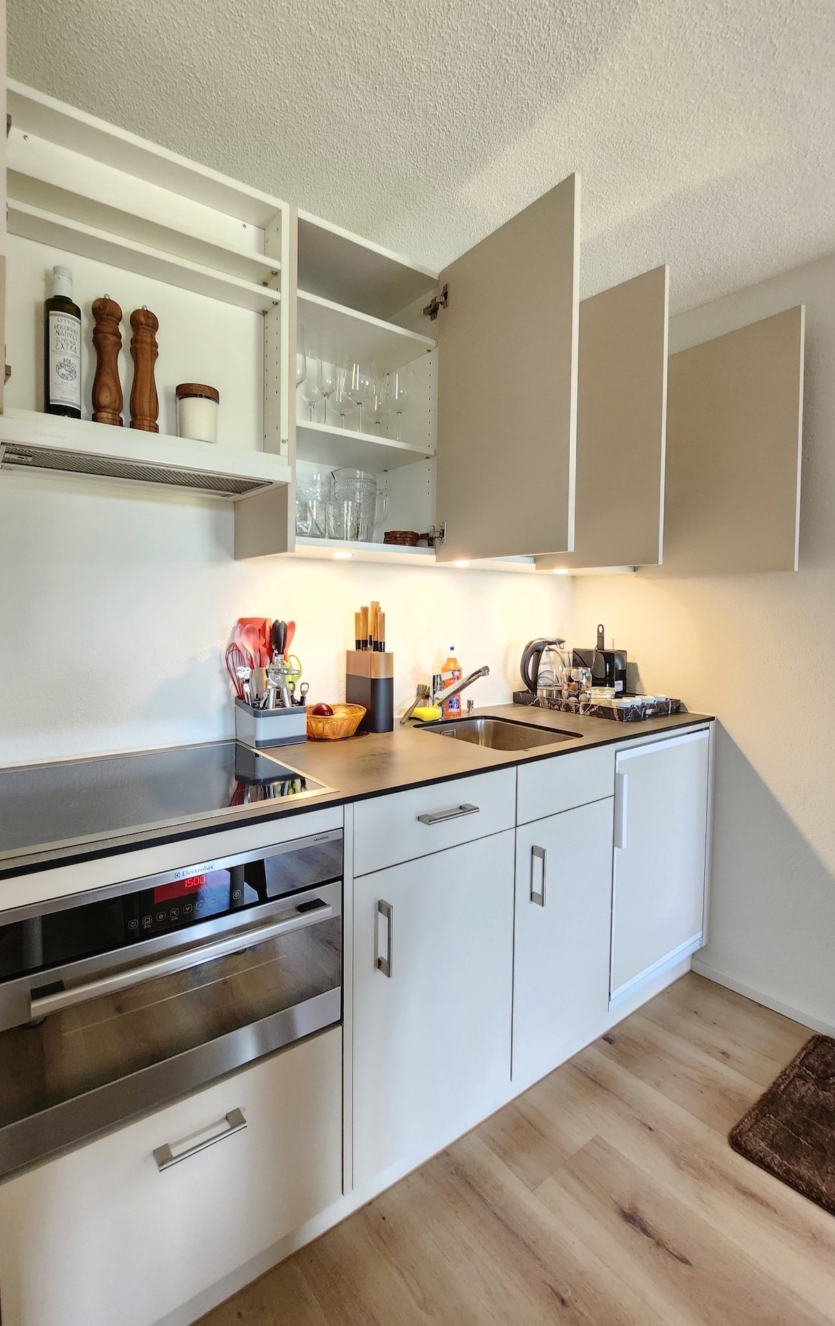 Du mietest ein neu renoviertes, modernes Studio Apartment mit neuer (kleiner) Küche mit Kühlschrank, Backofen, Geschirrwaschmaschine, Dusche/WC, TV, Internet/WLAN, Balkon, Holzparkett Boden. Das Boxspringbett (160cm) kann auf Anfrage in 2 Einzelbetten aufgeteilt werden. Sofa zum gemütlich sitzen und lesen/TV schauen. Esstisch (vergrösserbar). Alle Möbel und Ausstattung neu (2019) Du wirst eine perfekte Wohnung vorfinden, siehe Testimonials. Du mietest ein Apartment, nicht ein Hotelzimmer.