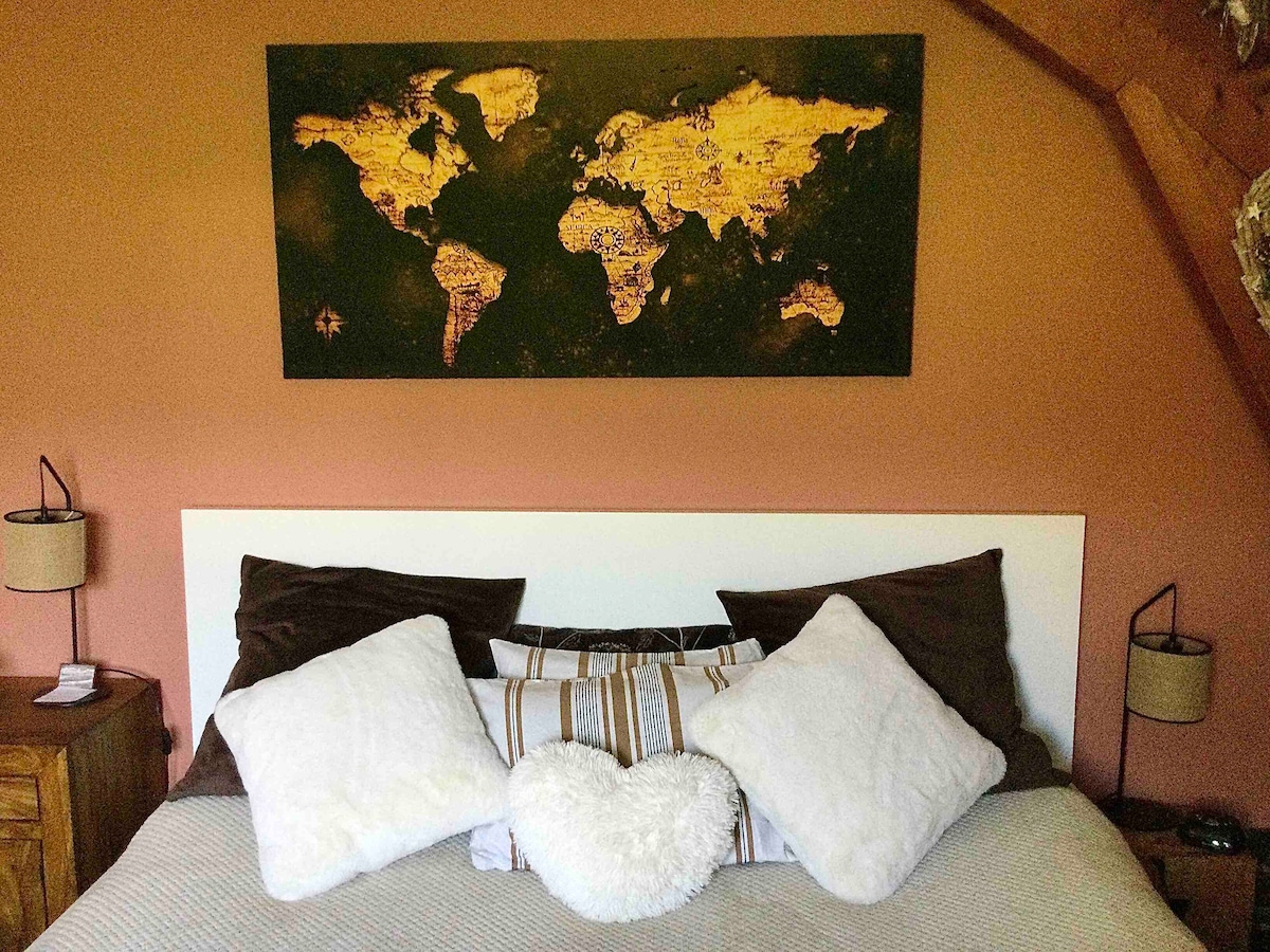 Grande chambre privé, fermé à clé de 14 M2 avec lit King Size. TV, espace bureau, Wifi rapide, USB 2.0 et prises de courant. Chambre à décoration et esprit ski et voyage. Depuis la fenêtre équipée de volets roulants, vue sur les montagnes du jura, la montée des oeufs de la station Crozet-Lelex. Espace partagé extérieur: salle de bain, kitchenette et jardin.
