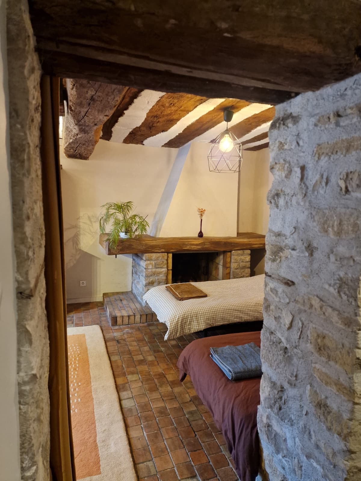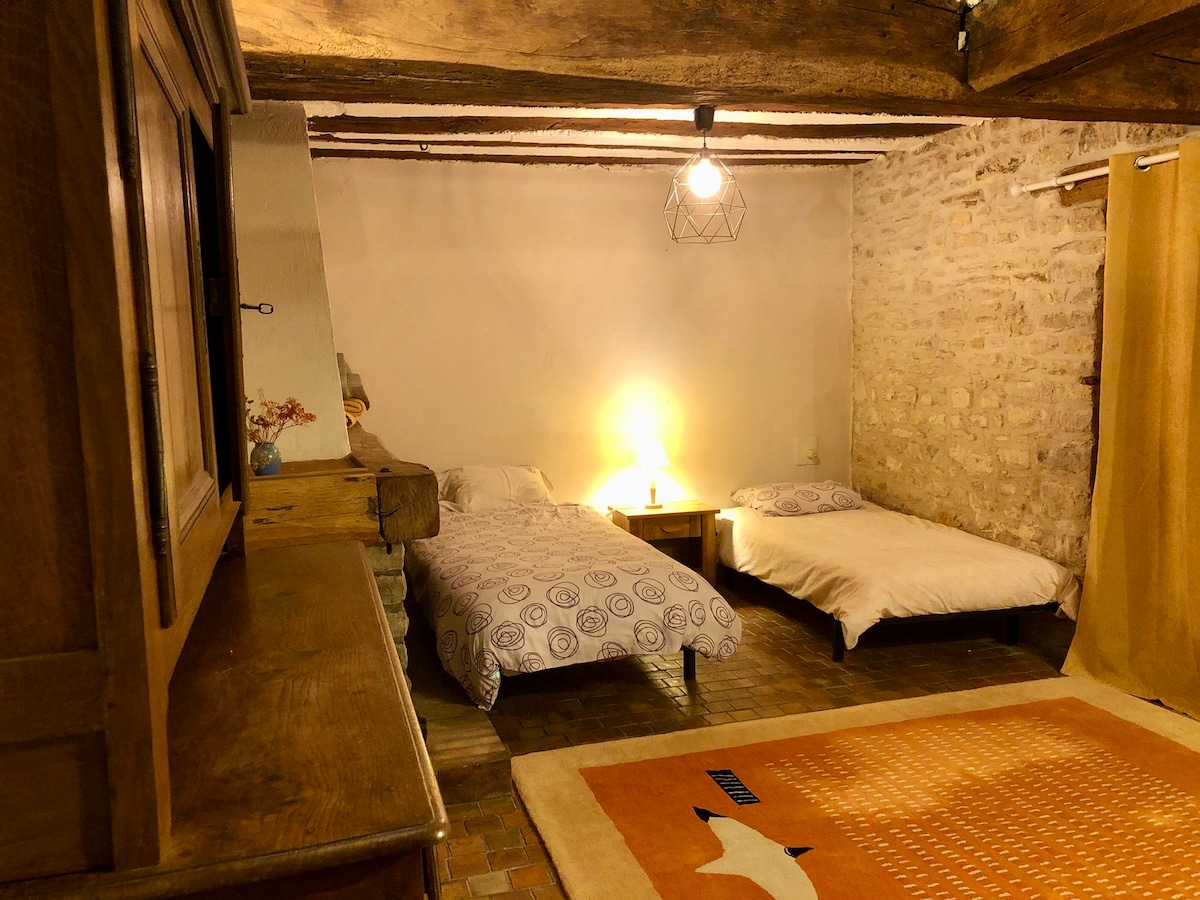 Très beau logement de 80m2 au RDC de la maison des propriétaires. Accès par un perron en pierre. Le gîte est complètement indépendant du reste de la bâtisse, y compris le jardin extérieur. Entièrement rénové dans un style chaleureux avec cuisine équipée, salle à manger avec coin salon, canapé convertible (possibilité de 2 couchages supplémentaires), WC, Salle de bain (douche à l'italienne) et cheminée. Terrain attenant non clos avec salon de jardin, barbecue. Séjour idéal pour une famille.