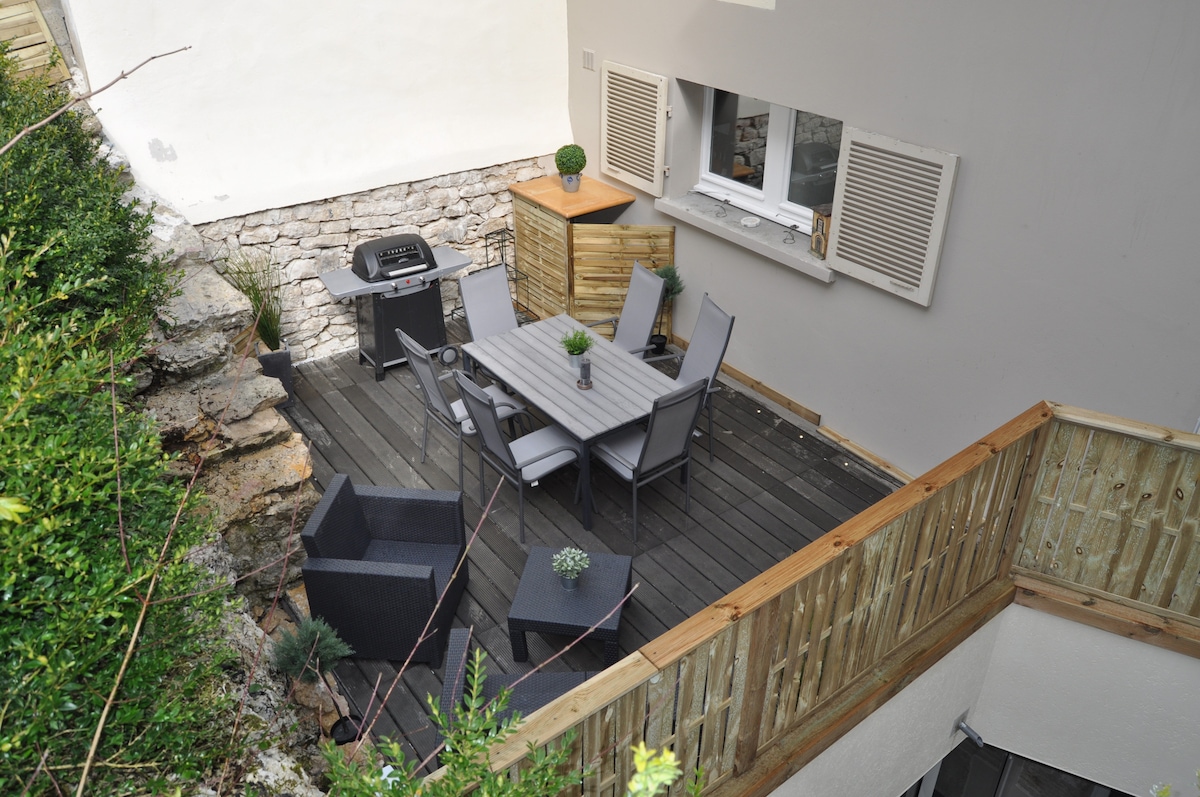 6 Rooms - 12 People Large house 5 mins from Lake Vouglans, in a quiet environment, all shops within walking distance, Renovated house of 270 m2 on 4 levels 6 bedrooms, 2 dressing rooms, 2 bathrooms, dining room, equipped kitchen with access to a shaded terrace of 70 m2 with tables and Plancha griddle, living room with wood stove. Arcade terminal, cinema room, skylight and charming view over the rooftops and the Haut Jura Mountains. Garage that can accommodate 2 cars