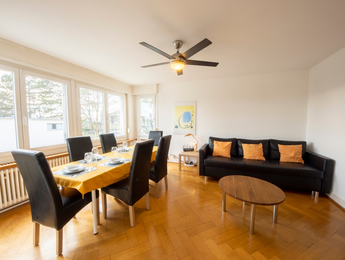 HIGHLIGHTS: 1) We will ABSORB the Airbnb Guest Service Fee of 14% 2) 1 parking lot available for rent 3) Storage facility available for rent to store bags.. Highlights: Washing machine & Dryer Adapter Ceiling Fan Sofabed & Baby Cot (on request) 3 train stops to Airport 1 train stop to Zurich HB 4 tram stops to Paradeplatz Indulge in the comfort of our 80 sqm space, featuring a well-equipped kitchen. Explore the safe neighborhood lined with trendy eateries, cafes & supermarkets – a rare gem.