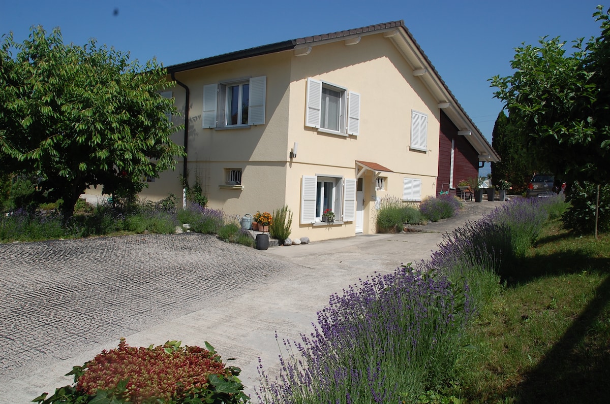 Notre maison se situe au coeur d'un village de campagne, à 20 minutes de Lausanne, au pied du Jura. L'appartement est au 2 ème étage de la maison dans laquelle nous vivons. Bus à proximité. Petits commerces à proximité. Nombreuses possibilités de balades, excursions et visites de musée.