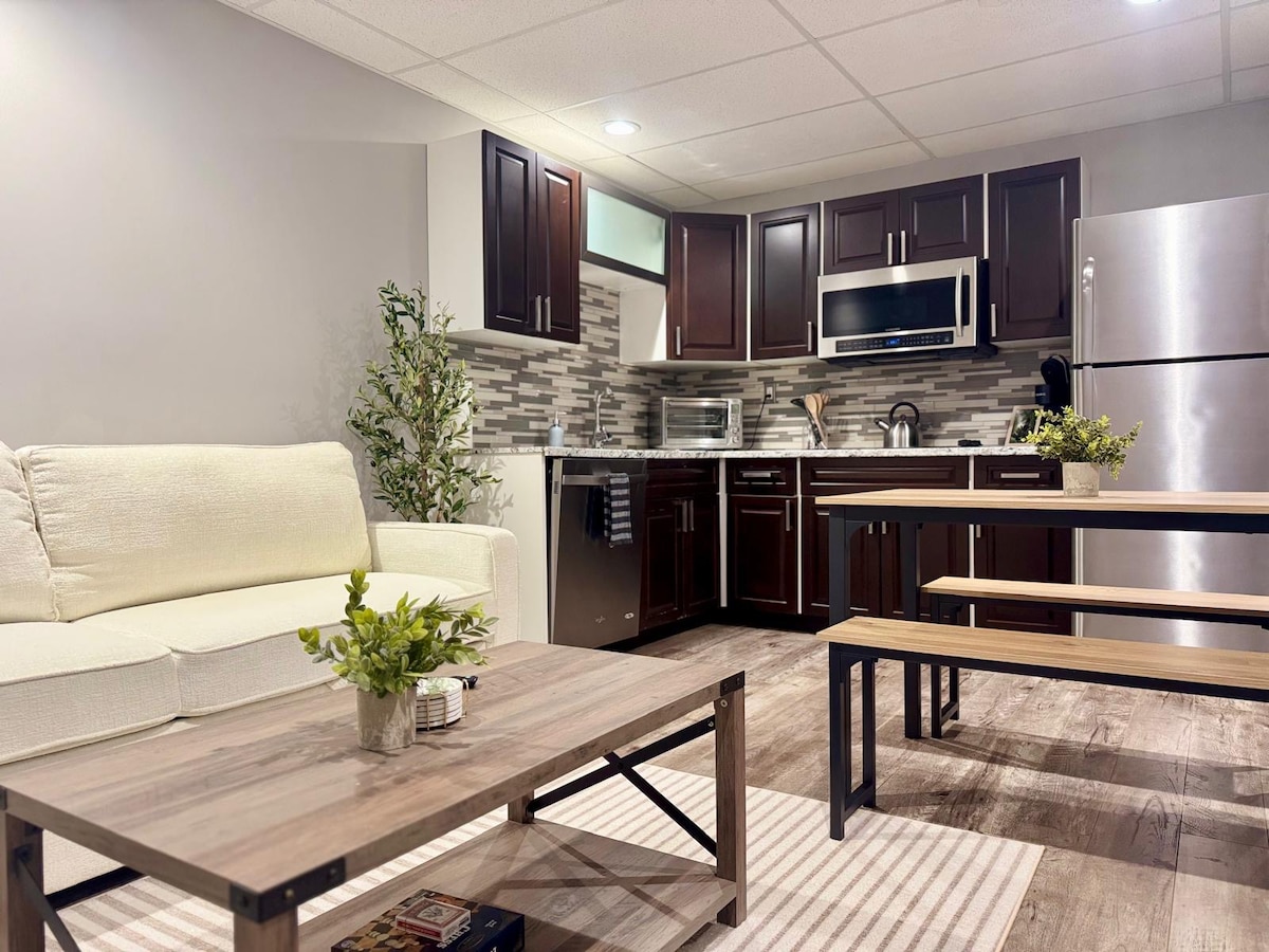 Our newly-renovated and romantic NYC loft-inspired basement suite offers over 1000 square feet of luxurious living space. With its high ceilings, floor-to-ceiling glass walls and French doors, and cozy in-floor heating, you'll feel like you're in a real loft. The high-end kitchen and bathroom add a touch of sophistication, and the 90s Simpsons arcade game provides hours of entertainment. Book your stay with us and experience the luxury and comfort of our suite.