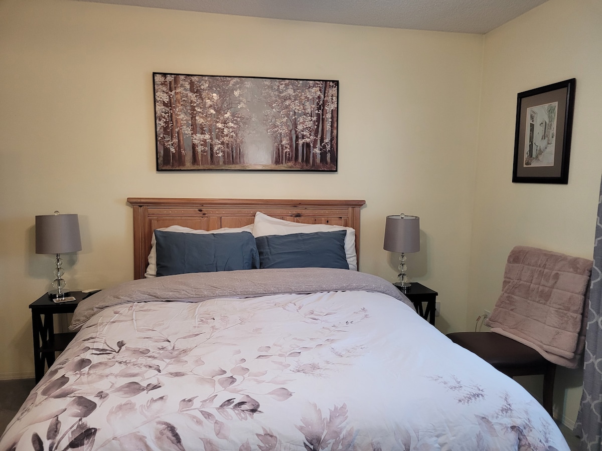 Relax and unwind in this spacious and stylish cozy suite with a view. This space is a walk-out basement suite with a private entrance, two TVs, pillow-top queen bed, dart board, kitchen, heated floors in the bathroom, rain shower, laundry, private patio, fenced-in yard, and access to a hot tub. The suite is located in the heart of St.Albert, with walking distance to all amenities, parks, and trails, and a short 20-minute drive to West Edmonton mall. Small dogs can be accommodated.