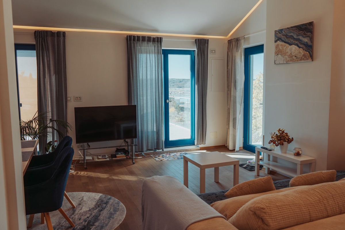 Brand new luxury spacious apartment with high ceilings, lots of natural light and impressive views Two premium mattresses 90x200. Left side H2 medium hardness. Right side H3 high hardness. White hotel linens and bedding Main Sofa Bed can beautifully accommodate one adult or two children Designer bathroom with a Smart TOTO Japanese toilet Minimalistic design premium Oakwood kitchen and dining table Floor heating and cooling + AC Free parking on property 5G Wifi and 4k Netflix available