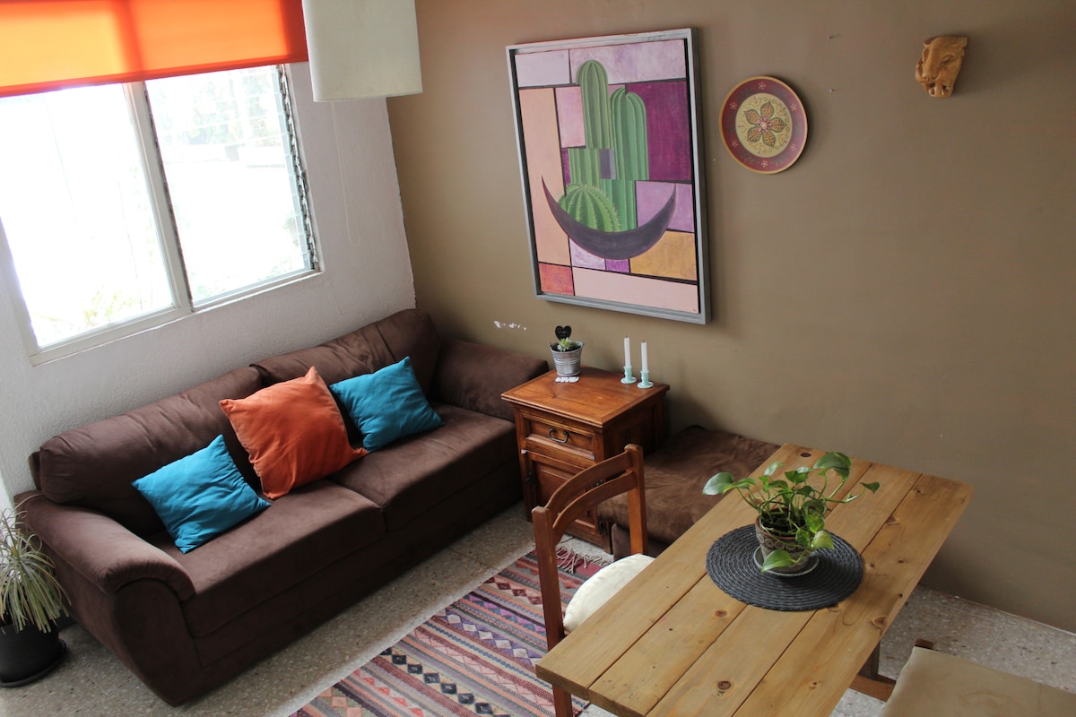 Departamento amplio, equipado y nuevo. Con un roofgarden espectacular para practicar Yoga, Meditación o simplemente disfrutar un delicioso café mientras ves el amanecer, o relájate mientras lees tu libro favorito. Ubicado privilegiadamente muy cerca de 5 de Febrero y Zaragoza, Colonia Prados Capilla. Cercano al centro de Querétaro, centros comerciales, los principales hospitales de la ciudad. 2 huespedes maximo, no reuniones, no invitados: FAVOR DE LEER LAS REGLAS ANTES DE RESERVAR.