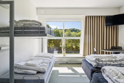 This room can accommodate eight people in a double bed and bunk beds. It has its own entrance and private bathroom. The room has a TV, free WiFi and clothes storage. A linen package is included in the price. Danhostel Vejle is a family-friendly hostel located in beautiful nature in central Jutland and close to some of the country's most popular attractions. During high season it is possible to purchase a breakfast buffet - please ask about this. We look forward to welcoming you.