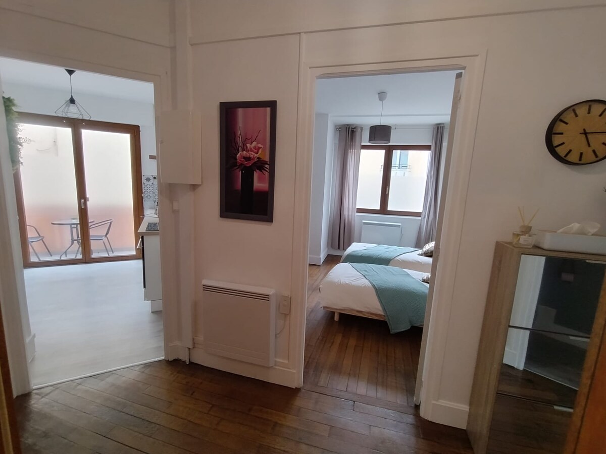 Logement lumineux situé en centre-ville, proche de toutes les commodités (boulangerie, supermarché, pharmacie, banque, restaurants) disposant d'un salon lumineux, une cuisine équipée (lave-vaisselle, lave-linge séchant), salle de bain avec douche, wc séparés, 2 chambres (un lit double et 2 lits jumeaux modulables pouvant être réunis pour un couchage double), et d'un petit balcon. Wifi gratuit illimité. Nécessaire de puériculture sur demande (lit parapluie, baignoire bébé, chaise haute).