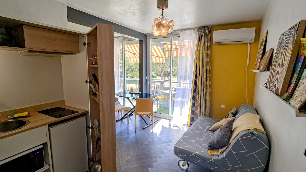 Nous sommes heureux de vous accueillir dans notre petit duplex de 30m2 entièrement aménagé et climatisé, situé dans une résidence calme aux portes de Montpellier. Proche de la ville et du tramway qui se trouve a 800m, à 1min à pied d’un supermarché pour vos courses, un accès direct aux pistes cyclables, une place de parking privée, et à proximité de l’autoroute pour une arrivée facile et un accès rapide aux plages.