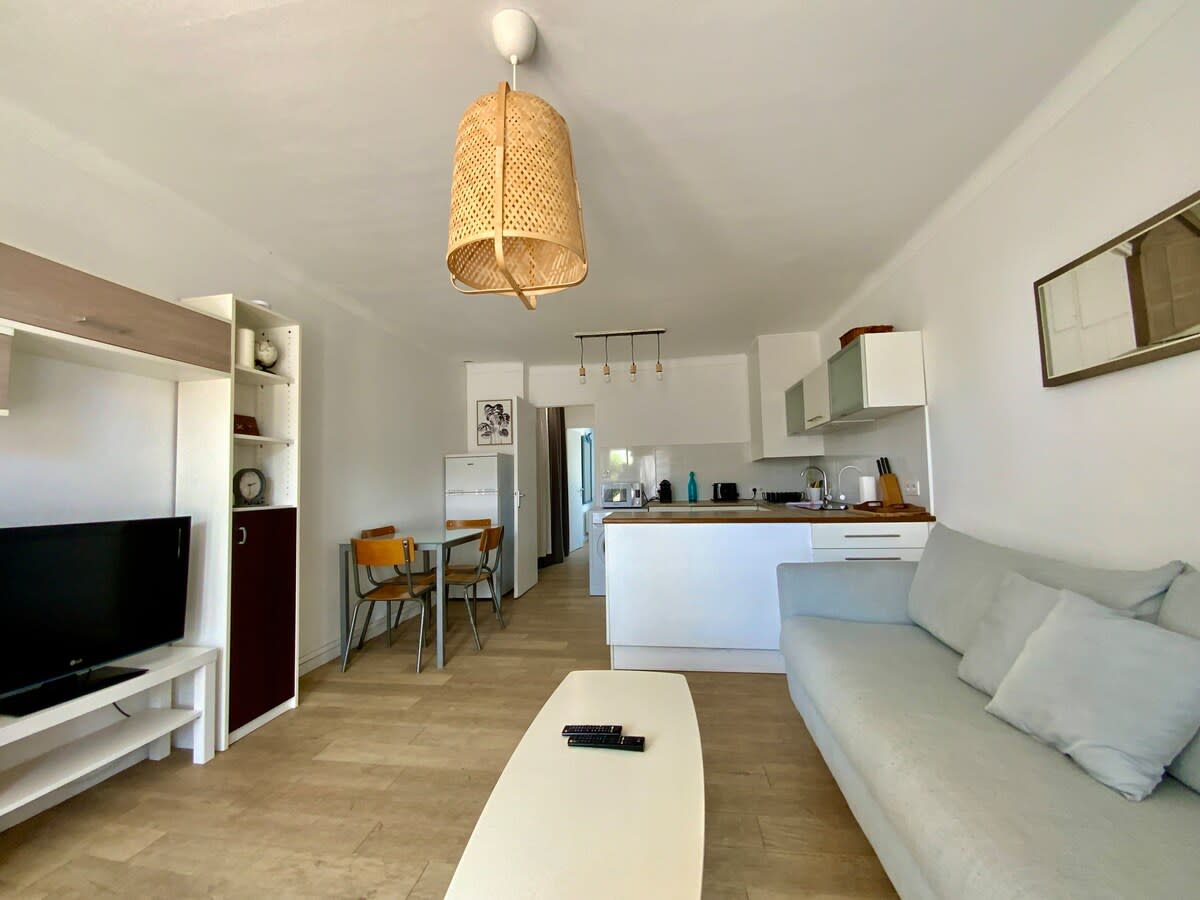Welcome to the South of France! Enjoy this charming studio apartment, fully equipped and decorated to a high standard, located in a 4-star tourist residence, with swimming pool (open from June to the end of September) and launderette (fee payable). The flat has a queen-size bed (160×200), a fully equipped kitchen and a beautiful bathroom. Accessible to people with disabilities (flat complies with PRM standards, particularly for deaf people). Free parking 100m away