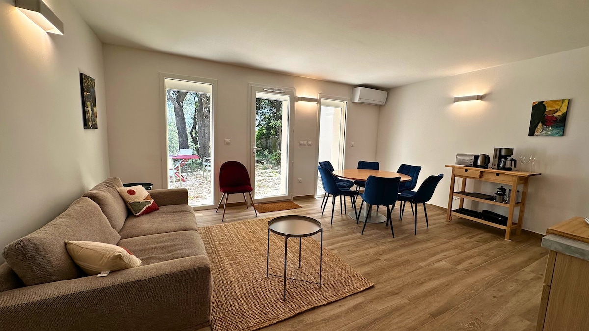 Petit gîte indépendant de 55m2 tout confort en nature, au calme, situé à 10 km de Montpellier, 10 km des plages s'ouvrant sur un jardin où vous pourrez profiter de la piscine partagée. Composé d'un séjour, cuisine toute équipée avec lave-vaisselle, 1 chambre avec lit 2 places et dressing, 1 salle de bain avec douche italienne, vasque et lave linge, un WC indépendant, climatisation, terrasse, jardin. Stationnement fermé devant le logement. A proximité de toutes commodités.
