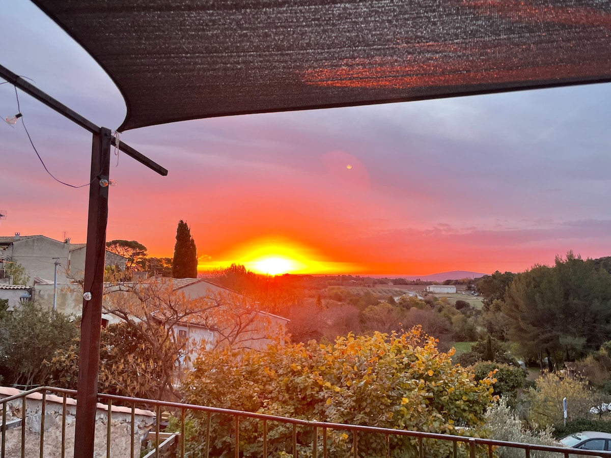 ECRIN DE VERDURE Logt de 60 M2 ( salon , cuisine , 2 ch, 1 SDB + 1 WC ind.)situé au Rez de chaussée d'une maison avec terrasse privative. le terrain de 28OO M2 et la piscine sont en commun avec les propriétaires. Situé à 2 pas de Montpellier ( 15 minutes) et de la Mer dans un village médiéval. Toutes commodités pour commerces et transport en commun. Prêt de vélo gratuit. Randonnées sur place. Accés aux équipements fitness + trampoline + table sous les pins......Log idéal pour famille.