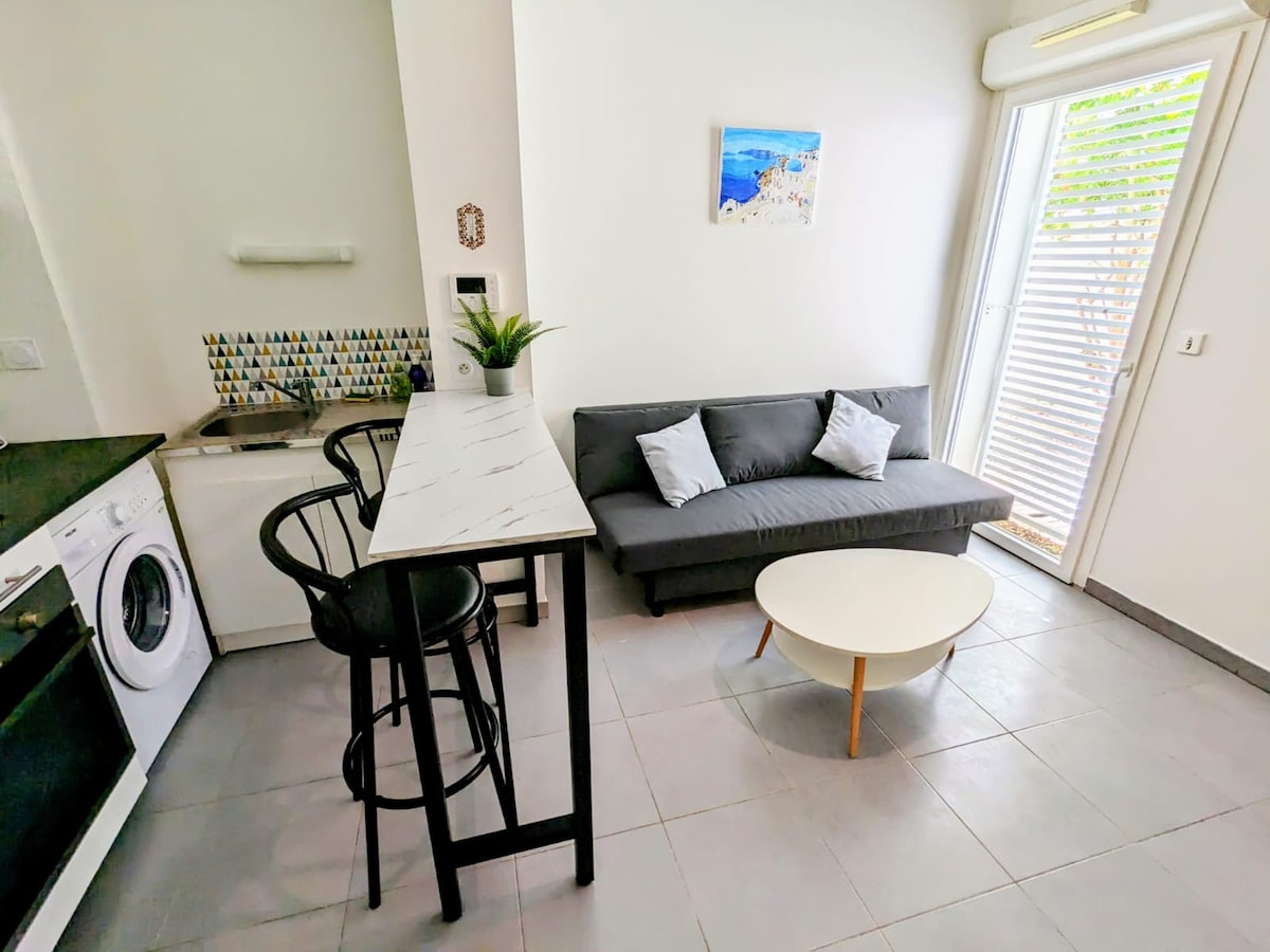 Charmant studio entièrement rénové composé d’une mezzanine, terrasse privative et clim. Au rez-de-chaussée d'un petit immeuble de caractère calme situé proche du centre-ville de Montpellier. À la limite du quartier Gambetta vous êtes à 10 min à pied de l'Arc de Triomphe, 15 min de la place de la Comédie et de la gare Saint-Roch. - Parking payant dans la rue (9h-19h), gratuit le soir, dimanche et jours fériés - Arrêt de Tramway "Plan Cabanes" (ligne 3) - Linges et serviettes sont fournis