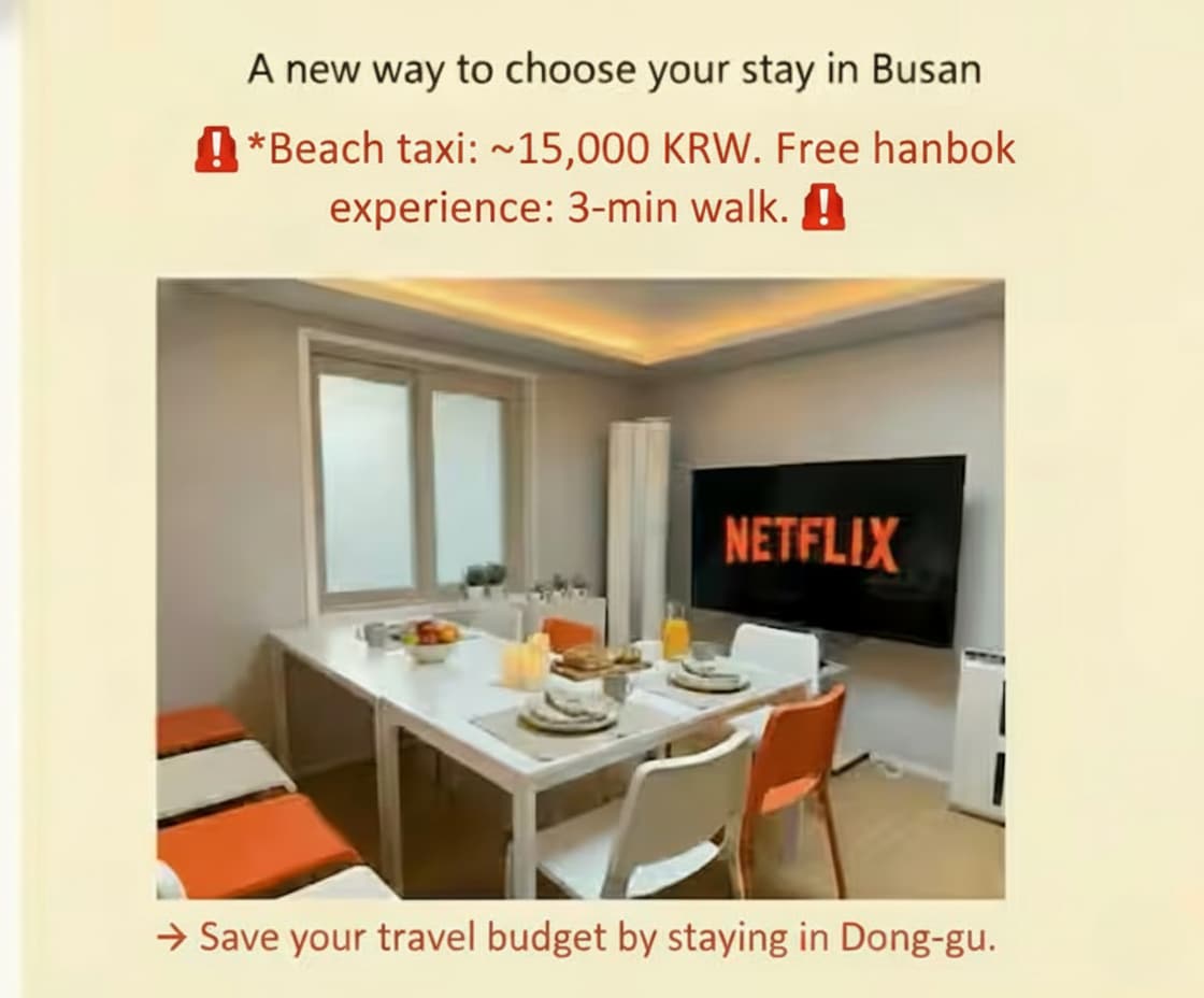 🏡 부산역 인근, 당신의 여행을 위한 아지트 부산 여행을 시작하는 가장 좋은 방법, 바로 부산역 근처에 있는 저희 숙소에서 하루를 여는 것입니다. 어디로든 쉽게 이동할 수 있어, 남포동·자갈치시장·광안리·해운대까지 당신의 발걸음이 닿는 곳마다 부산의 매력이 기다리고 있습니다. 👭 친구와 함께, 💕 연인과 함께, 👨👩👧 가족과 함께소중한 사람과 머물며 따뜻한 추억을 남기고 가시길 바랍니다. 🌿 특별한 환영과 작은 선물 체크인과 동시에 준비된 인원수에 따른 웰컴드링크(생수 3병) 늦은 밤 출출함을 달래줄 라면 서비스 3박 이상 머무시는 게스트분께는 🎁 아이스크림·커피·팥빙수 쿠폰 중 하나를 드립니다. (메세지 보내주세요^^ 겨울에는 따뜻한 먹을거리 쿠폰 증정)