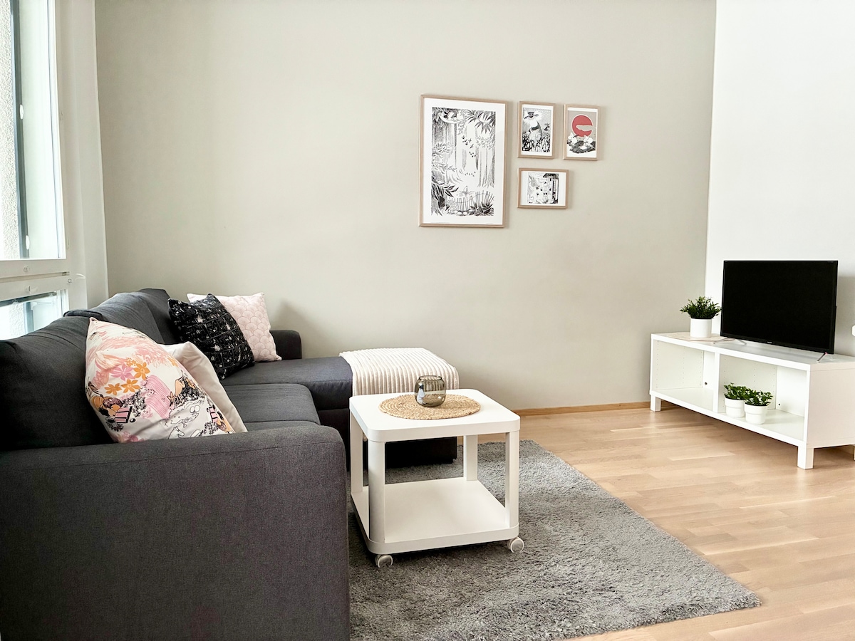 Moderni ja tilava kaksio (48m2) huippusijainnilla ydinkeskustassa. Keskustan palvelut ympärillä. Vastapäätä S-Market, joka auki joka päivä klo 23 saakka. Matkakeskukselta vain 5 minuutin kävely. Kysy tarjous pidemmistä majoittumisista. Modern and spacious two-room apartment (48m2) with a brilliant location right in the city centre. A grocery store (open until 11pm) across the street. Just 5 min walk from train/bus station. Ask for an offer for longer stays.