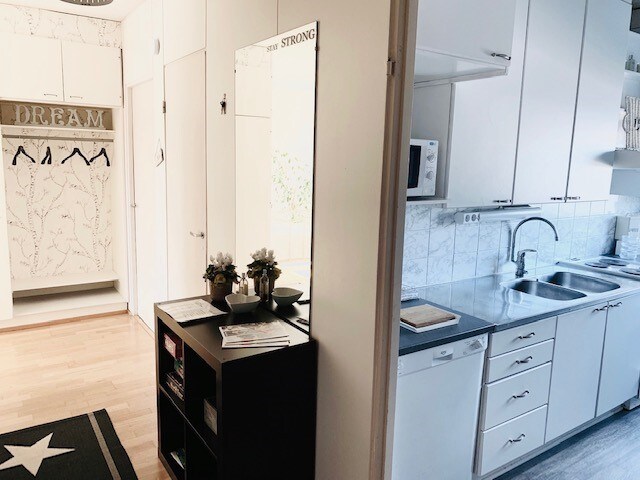 • Two-room apartment. • Glazed terrace. • Wifi and Netflix. • Outdoor activities nearby. • Free parking. Great connections to city center. Nearest bus stop is only 200 meters away. Within 500 meters, there are two grocery stores, a pharmacy and a pizzeria. Shopping Center Seppä is 2,7 kilometers away. Kangaslampi activity park is 300 meters away. Kangasvuori nature trail and Huhtasuo Disc Golf Park are 600 meters away. Huhtasuo sports field and the soccer hall ”Huhtahalli” are 1 km away.