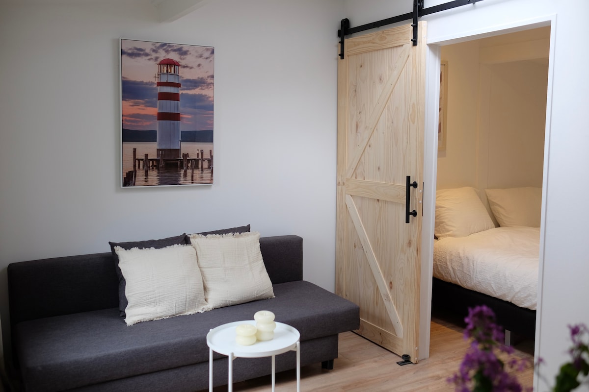 Step into our comfy tiny home, where modern coziness meets simplicity. Inside, you'll find a nice workspace. Perfect for getting stuff done or just chill-out since the screen also doubles as a smart tv. It's a snug spot where you can relax and feel inspired, without any fuss. Our tiny home has been completely redone with a new layout in 2024 to get the most out of each square meter. We hope you enjoy it as much as we enjoyed rebuilding it <3