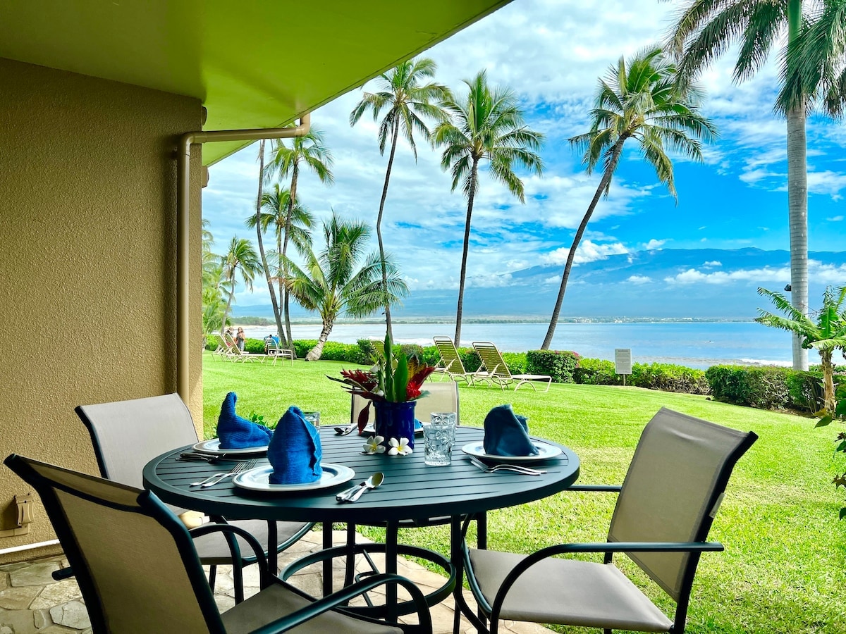 Maui Gov’t Approved Short Term Rental - Hotel District- Direct beach access with ground floor spacious lanai. Unreal views from this one bedroom, one sofa bed ground level entry, beachfront condo located directly on Kaanapali Beach. Central AC with LR and BR providing separate direct walkout to the lanai and 15 steps away is the beach! 75" TV, Sonos system, Apple TV, washer/dryer etc. Stocked kitchen includes coffee makers and supplies to get yourself ready for romantic dinners with the sunset!