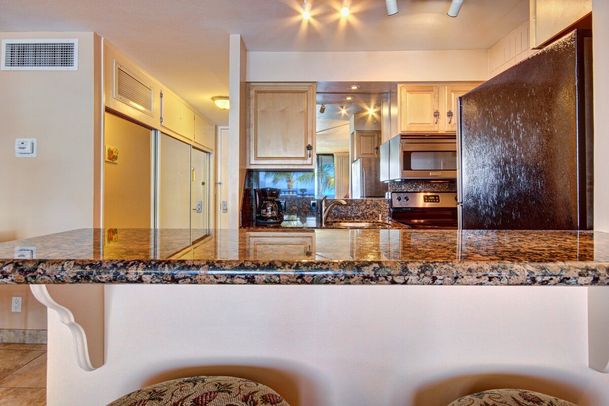 Walk the beach and sand from our complex. Enjoy the Sunsets on our Lanai. Condo includes everything you will need (Fully stocked kitchen w/stove, refrigerator, microwave, coffee maker, etc.). King-size bed, flat-screen T.V., Free Wi-Fi. Granite counters in kitchen & bathroom. Free AC!
