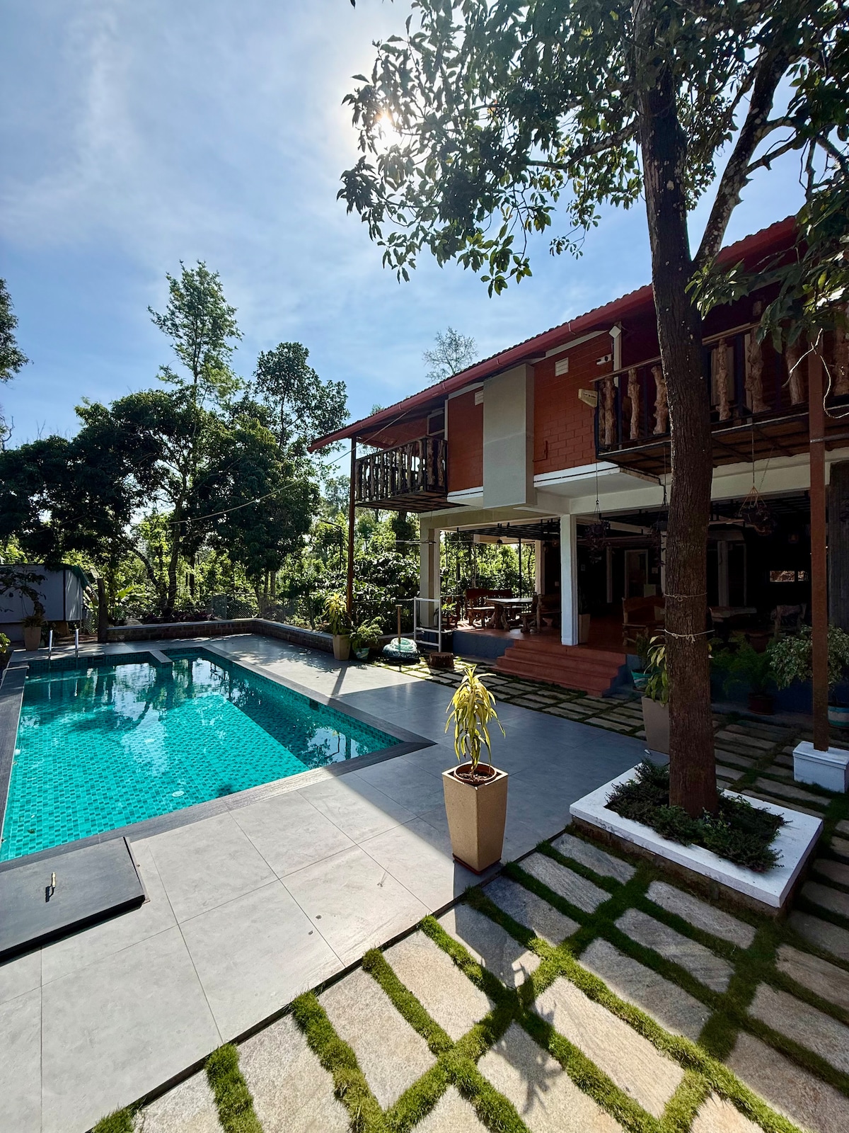 my place is located in the midst of coffee and pepper plantation . its completely surrounded by greenery.each of our rooms have a private balcony for your privacy. food is available at the property. activities :estate walk, bonfire ,bbq ,badminton. basketball ,swimming pool etc.