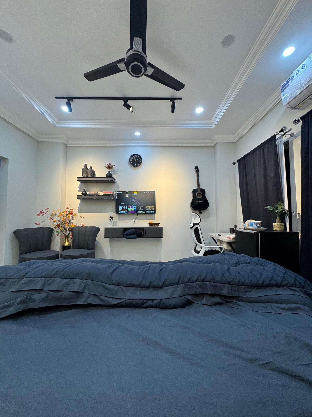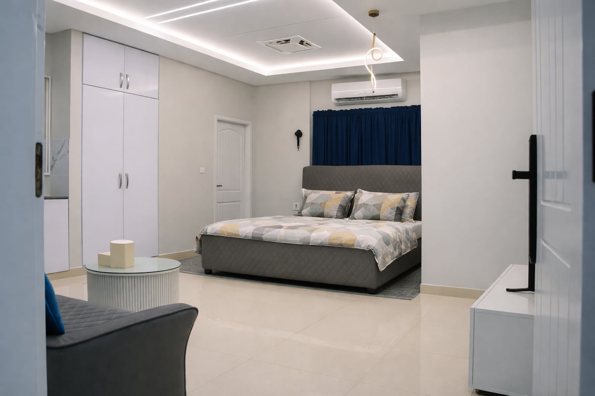 Escape to our serene bedroom oasis, perfectly suited for couples and small families seeking a relaxing getaway .Enjoy a comfortable night's sleep in our cozy bedroom . The apartment features a comfortable bed, a well-equipped kitchenette, and a fully smart tv, air conditioner, 24/7 internet, electric heating rod for hot water. Located in a prime location, you'll have easy access to nearby attractions such as imtiaz mall, Buch international hospital, cinema and restaurants .