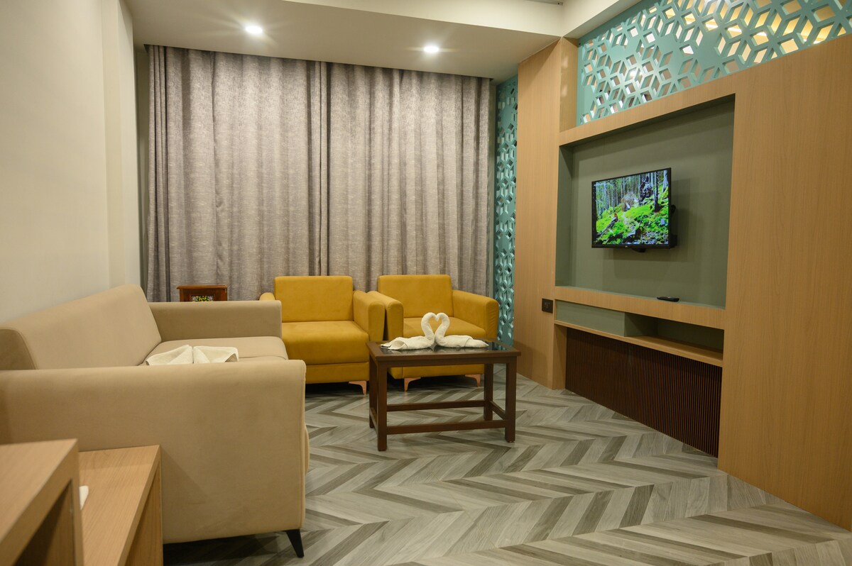 The Suite Room offers a spacious and elegant stay with a separate living area, comfortable king-size bed, air conditioning, flat-screen TV, work desk, and free Wi-Fi. Designed for added comfort and privacy, it includes a well-appointed bathroom with modern amenities, making it ideal for families, long stays, or guests seeking a premium experience.