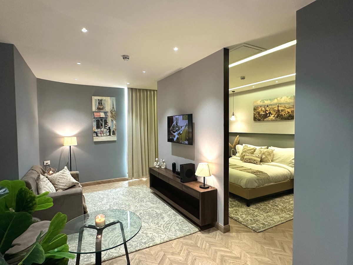 Welcome to our amazing studio apartment which is situated in a high rise building. This is a completely fresh apartment with all new furniture. Wide garden patio makes it unique in class. The place is perfect for relaxing and enjoying scenic view of modern architecture. Apartment is loaded with smart tv (all applications works), big mirror wall, a cozy double bed, big wardrobe with locker, 4 seater sofa, stylish coffee table, fridge, microwave, induction,electric kettle, toaster & many more.