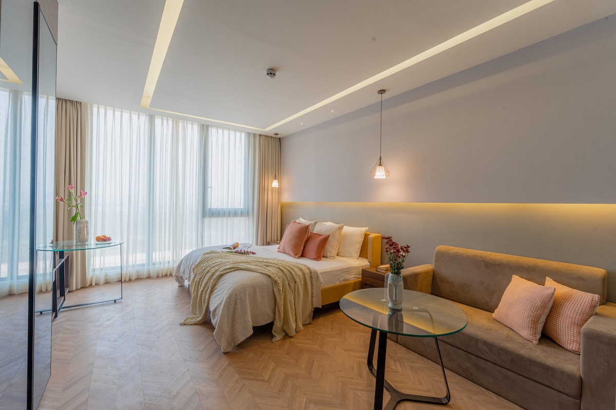 Experience modern comfort at its finest in this beautifully designed room at AIPL Joy Square. Featuring floor-to-ceiling windows with stunning city views, cozy bedding, and stylish interiors, it’s perfect for both work and relaxation. The soft lighting, elegant décor, and thoughtful details like a comfy sofa corner and workspace create a warm yet luxurious vibe. An ideal stay for those seeking comfort, convenience, and class in the heart of the city.