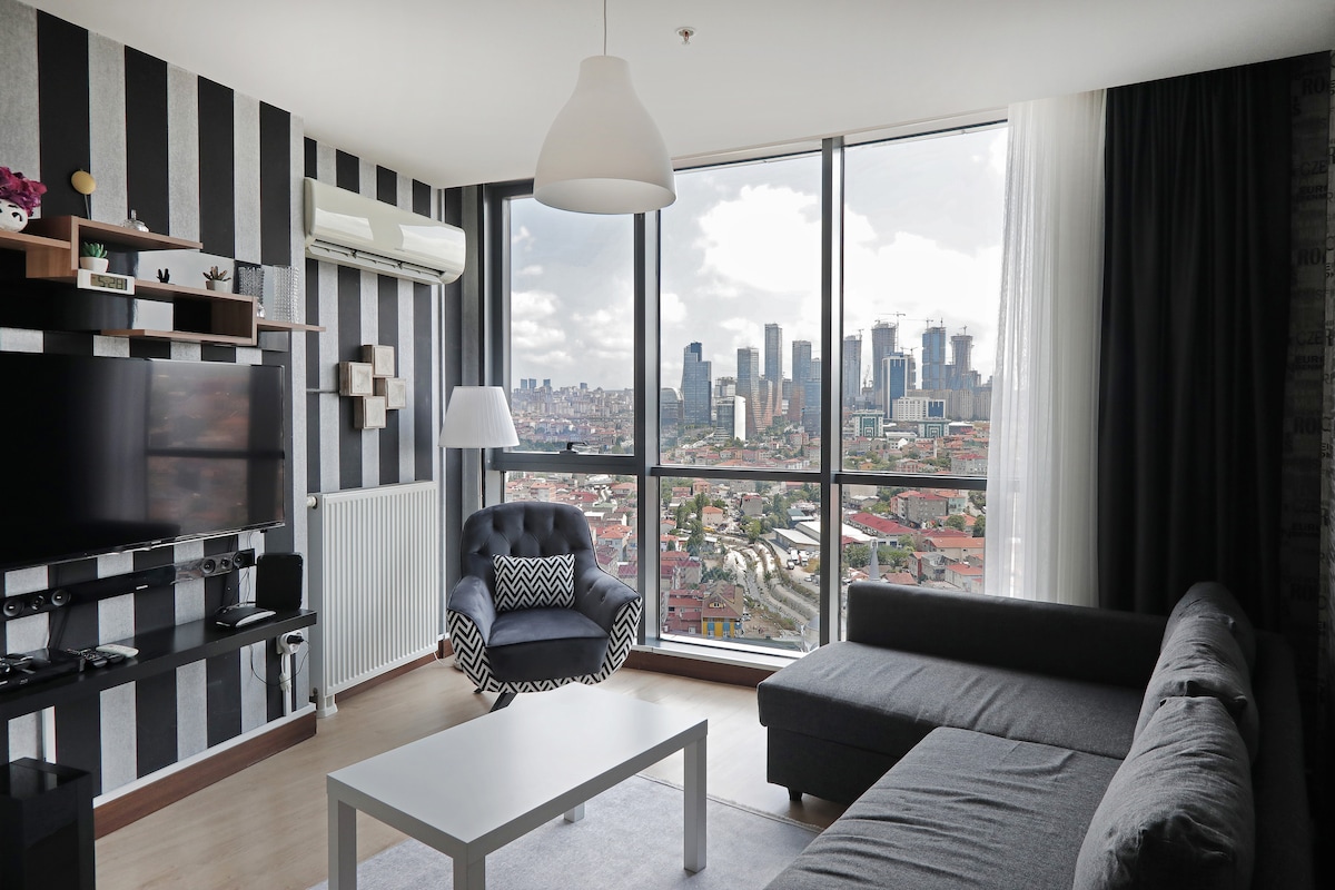 Great residence with bird looking from top at the center of the city. Amazing design of the residence will impress you. Moreover from top to bottom windows you will enjoy panoramic view of the city. Especially nights. All cooking equipment and hot drink machines you will reach at flat. Furniture are new and stylish. The position of the place is very strategic. Very close to bosphorus,3 big mall,watergarden etc. Not close only one place but also as strategic position easy react to everywhere.