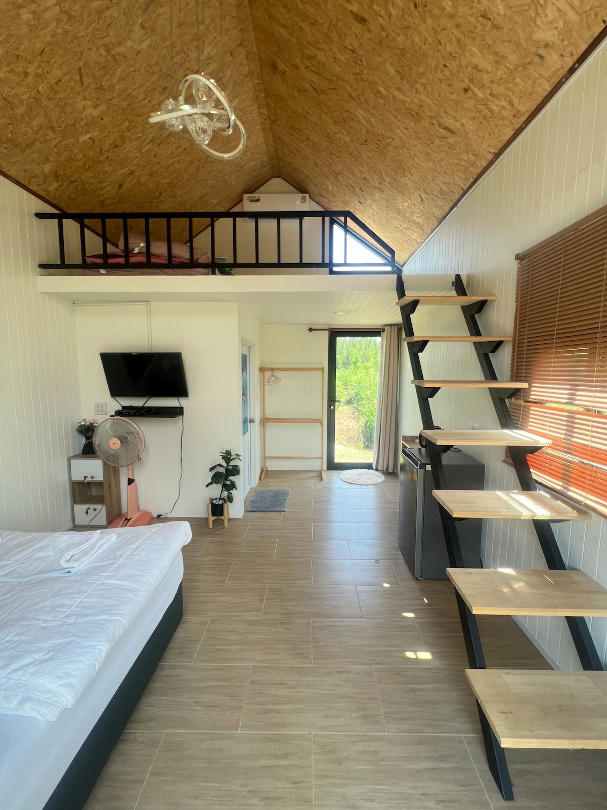 这间小屋坐拥山景,四周绿树环绕。温馨舒适的空间可容纳两人,配备一张双人床和一间浴室。小屋后方的小山是欣赏日出的绝佳地点。阳台是放松身心、享受烹饪乐趣的理想场所。 小屋距离曼谷2.5小时车程,距离华欣50分钟车程。自驾出行十分便捷。如果您不方便自驾,也可以按日付费租用带司机的车辆。此外,每笔预订收入的5%将用于购买食物,喂养山区的流浪狗。