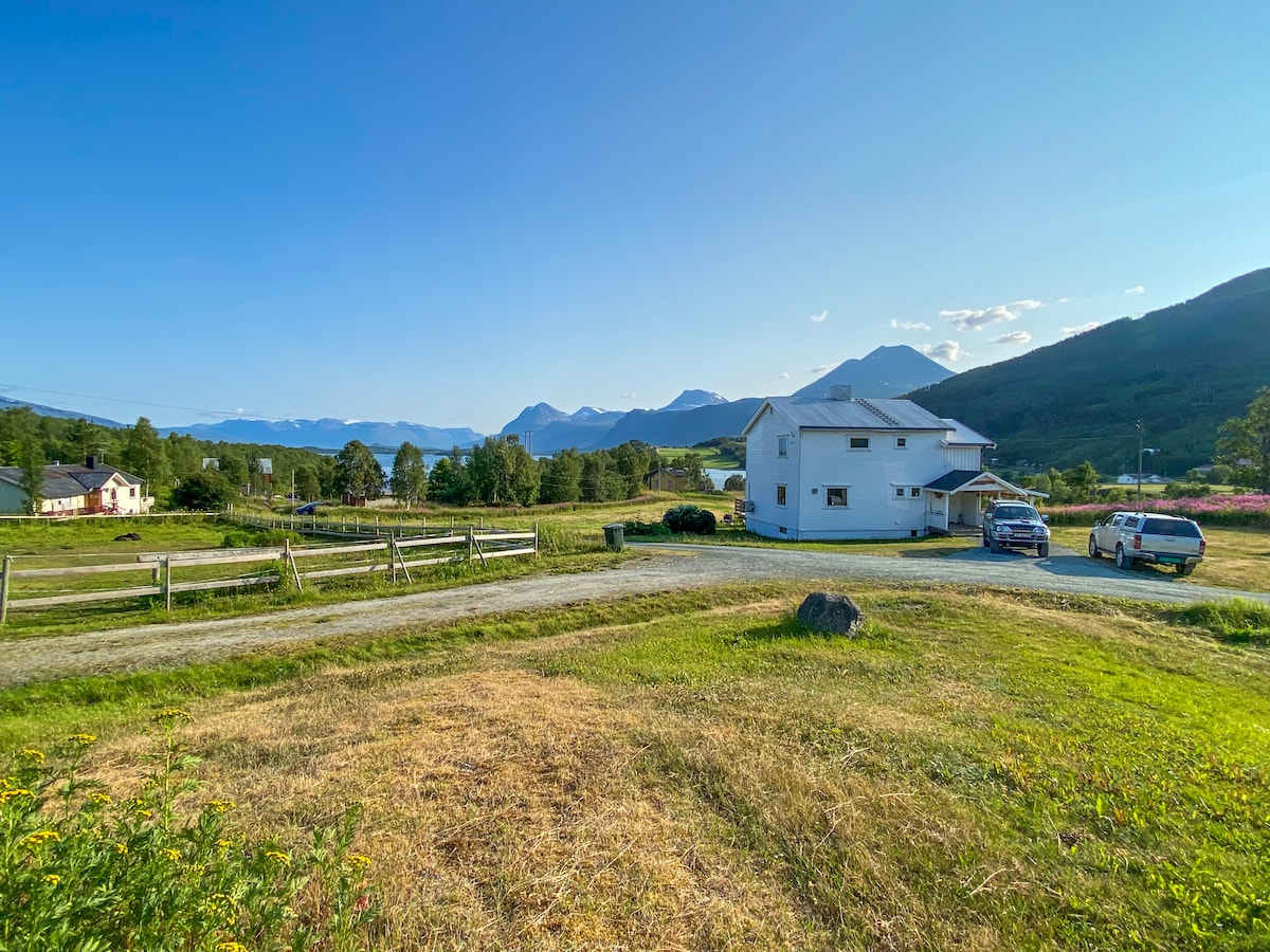 Modern and cozy home, overlooking the beautiful Lyngen Alps. The best thing about this peaceful retreat is the location, right in the middle of nature, secluded and only minutes from beautiful hikes, world class skiing. The meadow where the house sits, extends all the way down to the pebble beach. In the winter, watch the northern lights above the lodge. In the summer, sit on the terrace all night enjoying the midnight sun. The house was built in 2016, well-equipped, very comfortable beds.