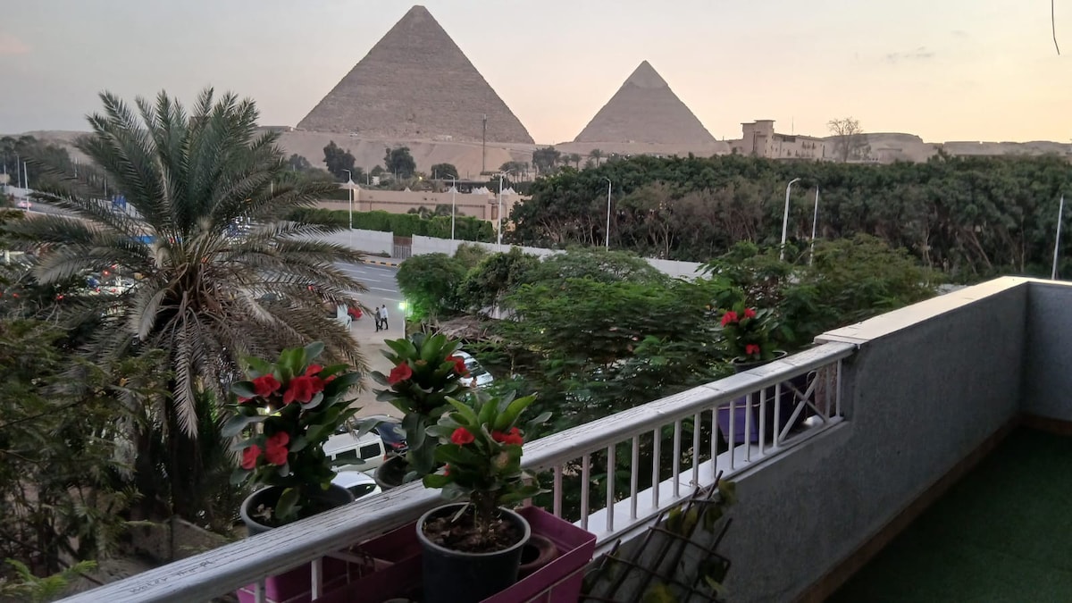 Welcome to our apartment! Just 5 minutes’ walk from the Sphinx and Pyramids entrance, with a stunning balcony view. Located in a safe and lively local area near restaurants, cafés, fruit shops, markets, and pharmacies. The apartment is fully air-conditioned, with fast unlimited Wi-Fi, a well-equipped kitchen, clean sheets, fresh towels, and a calm atmosphere. Probably the best place to enjoy the Pyramids view!