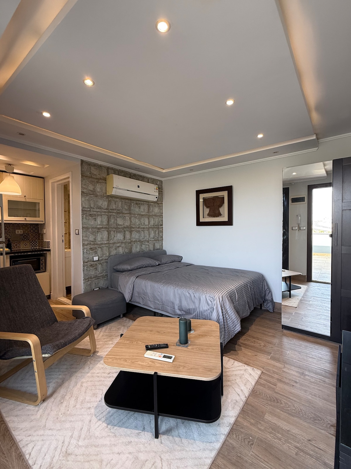 This unique place has a style all its own. Escape to a private rooftop retreat in the heart of Zayed, directly in front of Al Ahly Club . A unique studio designed for comfort, style, and tranquility. You’ll be perfectly located to explore the city while enjoying peace and privacy. Just 20 mins to the Grand Egyptian Museum of Civilization and 25 mins to the pyramids and Sphinx Airport. NB: No unmarried couples.