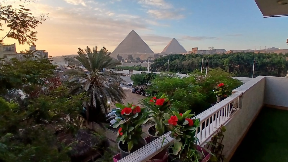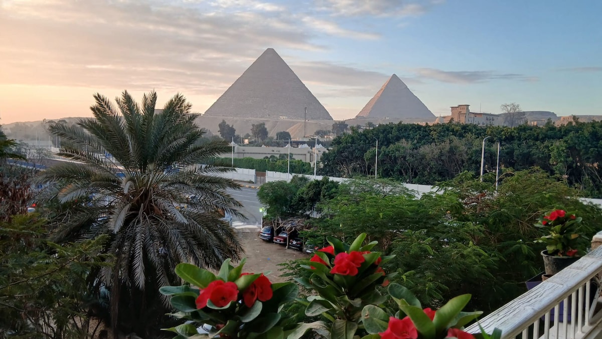 Pyramids view with10 mins to visit ,(3 rooms/2 bathrooms) It's an entire apartment that no one shares with guest. Upscaled elite quiet area for families/groups , 15 mins walking to GEM,( 30 mins by car to old museum) ،what makes us special that we are not (hostel or inn) we are a real cozy house, (host) and (Guest) no employees (We treat our guests honestly as friends, not just guest. We can manage the pick up and drop off from and to the airport if u want. U also can ask for recommendations .