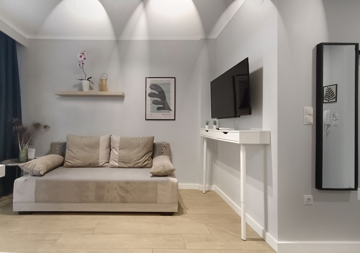 Stylish, just renovated studio only 10 minutes from the city center of Thessaloniki Smart, expert design, with island vibes, a true oasis in the middle of the city. Fully equipped kitchen, Nespresso machine, gas heating, high speed optic fiber internet with up to 300MBps, netflix account. Ideal for business travellers and sightseers. Welcome and enjoy your stay!