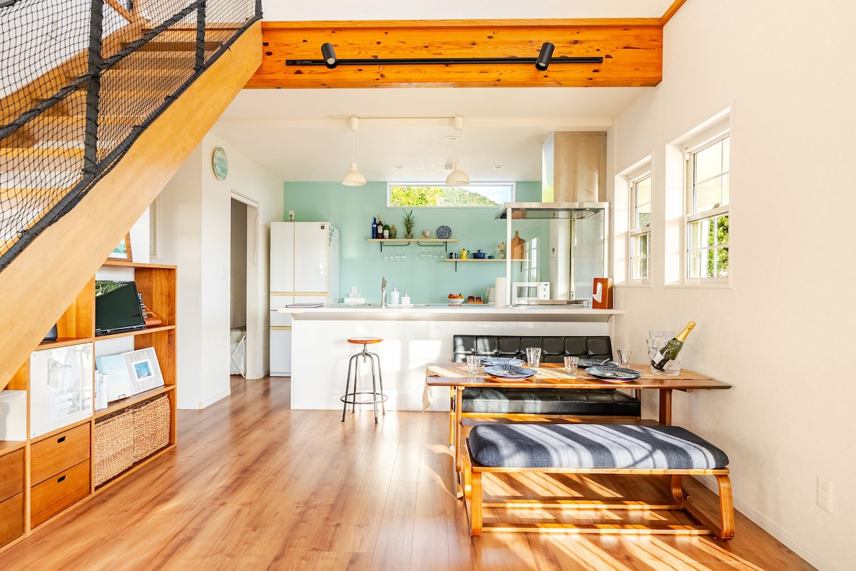 Ocean view! Beach (1 min) - private vibe. Enjoy Sakurajima, Kinko Bay, & Chiringashima views from the living room. Exclusive private house (1 group/day) for ultimate relaxation. Fall asleep to the sound of waves – we're right by the sea in Ibusuki! Pets welcome. Retro house, quiet. Car needed (5-6 parking/20 bikes). Garden BBQ. Free WiFi. Massage chair. Washer/dryer. Full electric kitchen, dishwasher, hot/cold water. 5 free bikes. Fishing: beach (sillago), rocks (rockfish), near octopus.