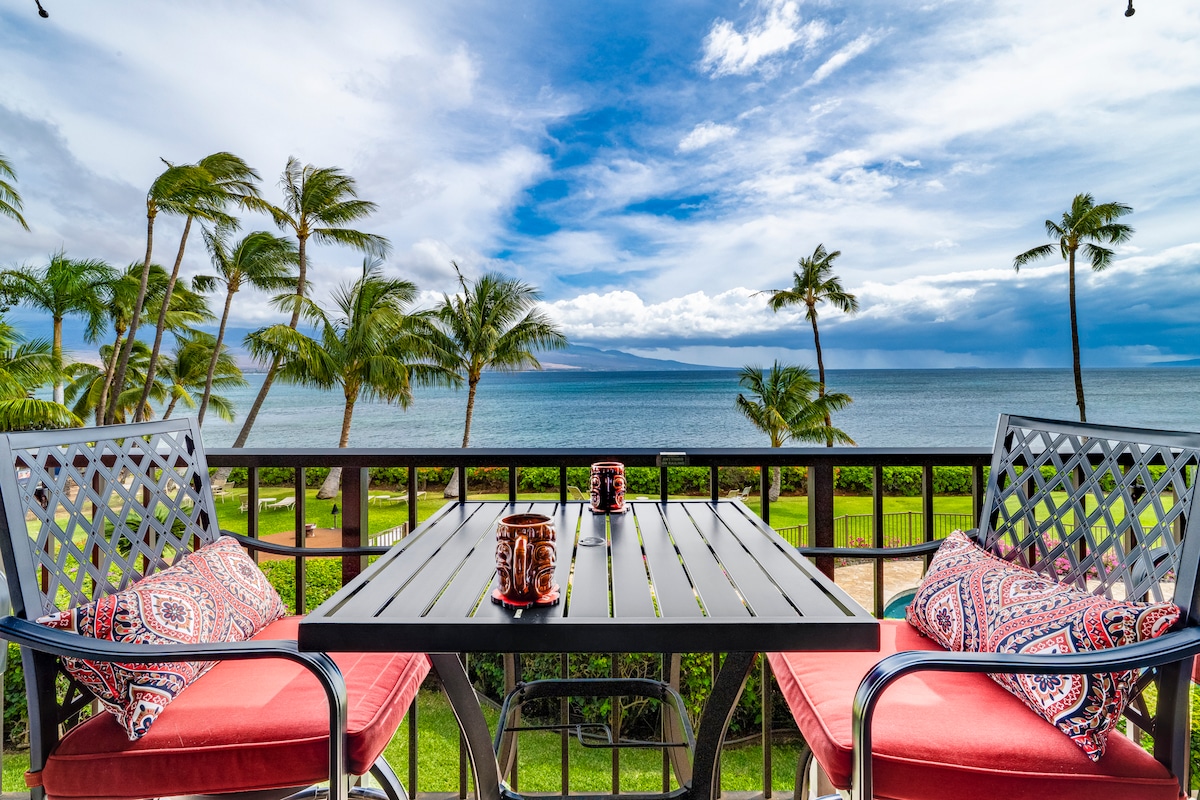 Halerentals MAK A5 is a completely renovated beachfront condo, with high end materials throughout. RH furniture, cotton sheets, marble shower, gourmet kitchen, & a/c in every room-- just steps away from 3 miles of undeveloped beach! Bright spacious ground floor 1bed/1bath condo with fully stocked kitchen, and views of the beach, bay, & Haleakala volcano. King RH sofa bed in living room for up to 4 guests. Ideal for swimming, SUP, snorkeling, and surfing-- amazing value for families and couples.